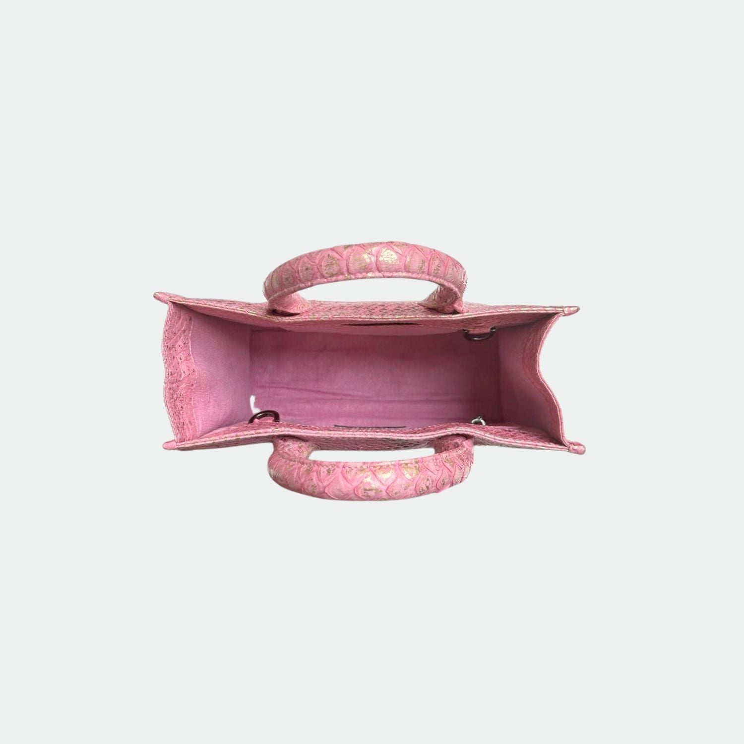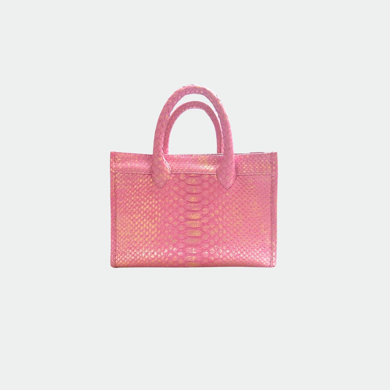 Python bag with cotton lining and rigid handles. One main compartment with a small pocket and a zipped pocket. Removable python shoulder strap.