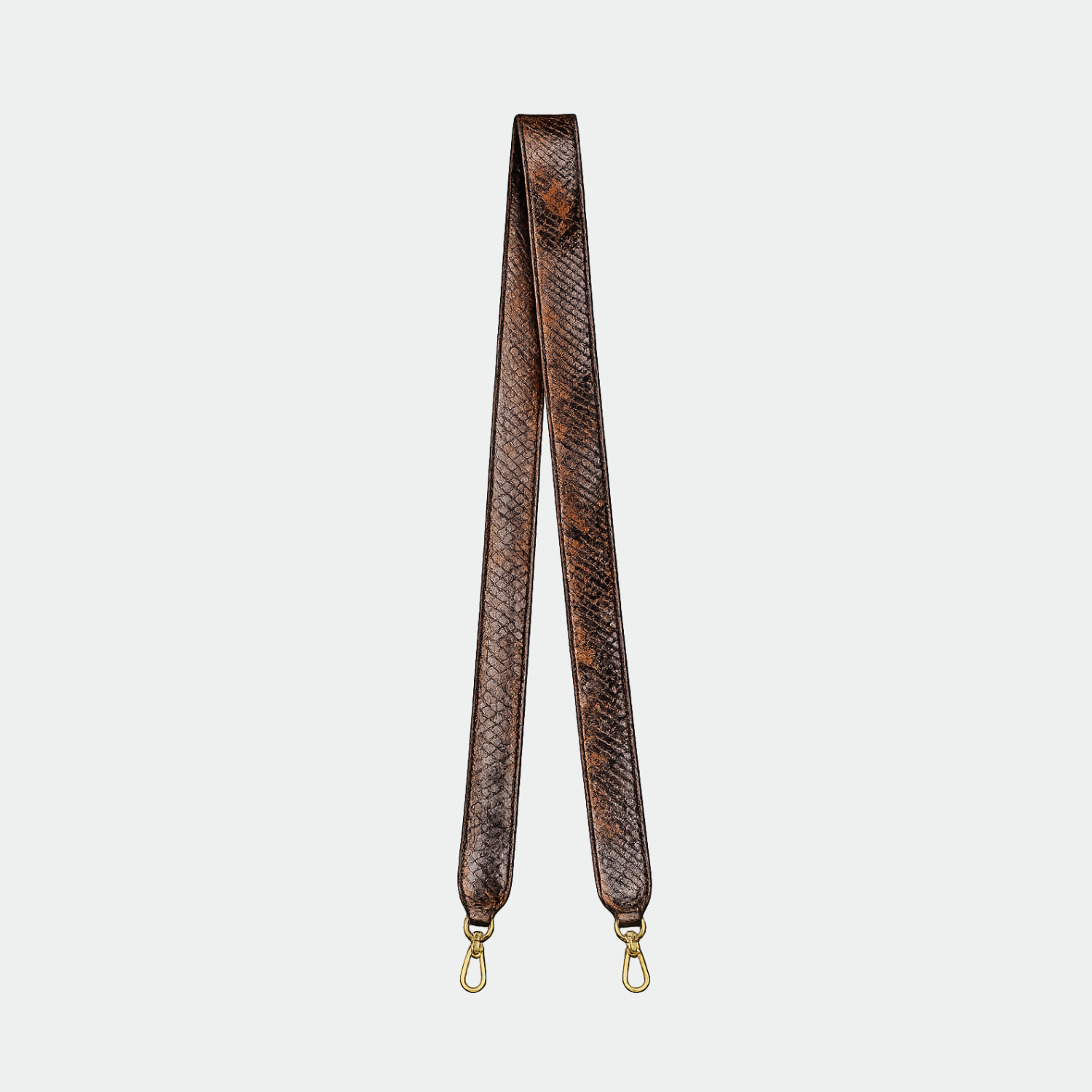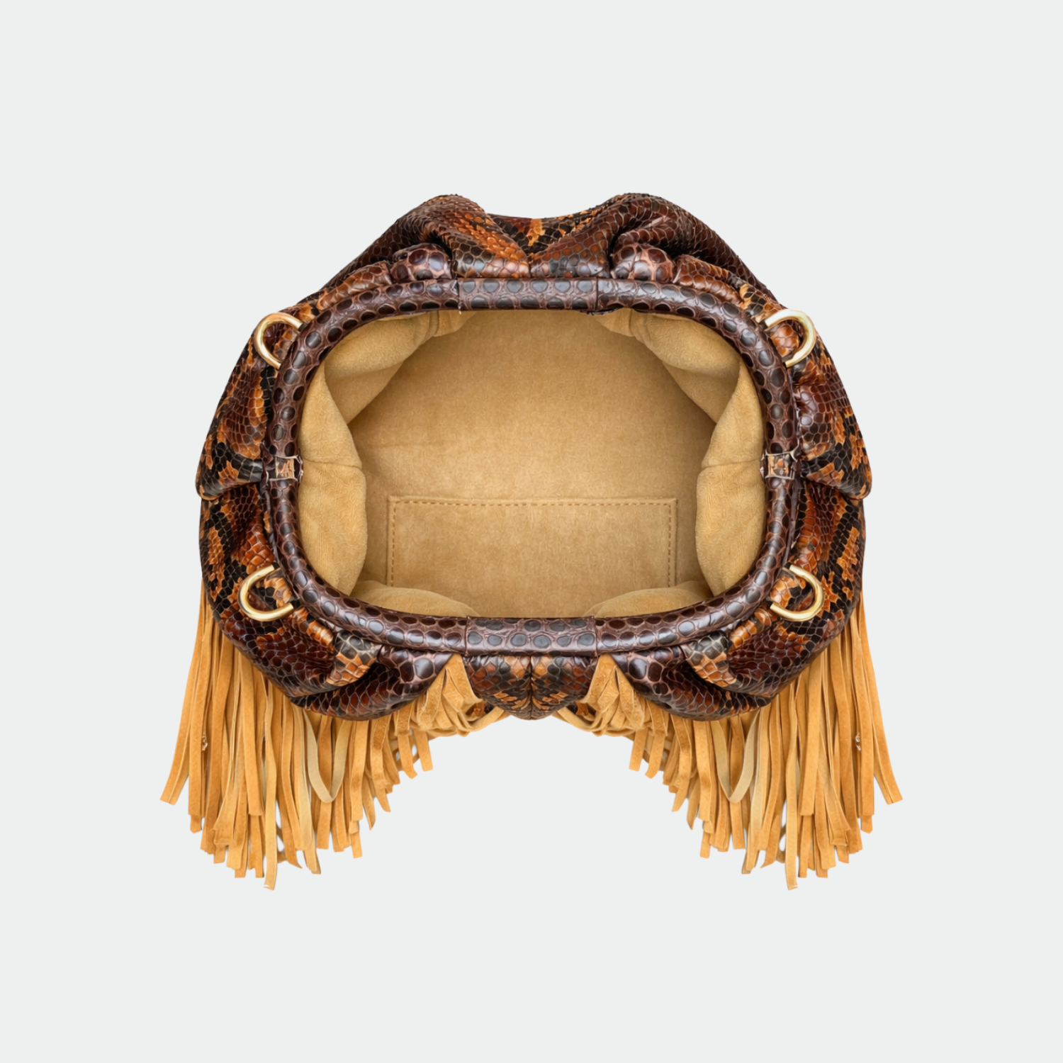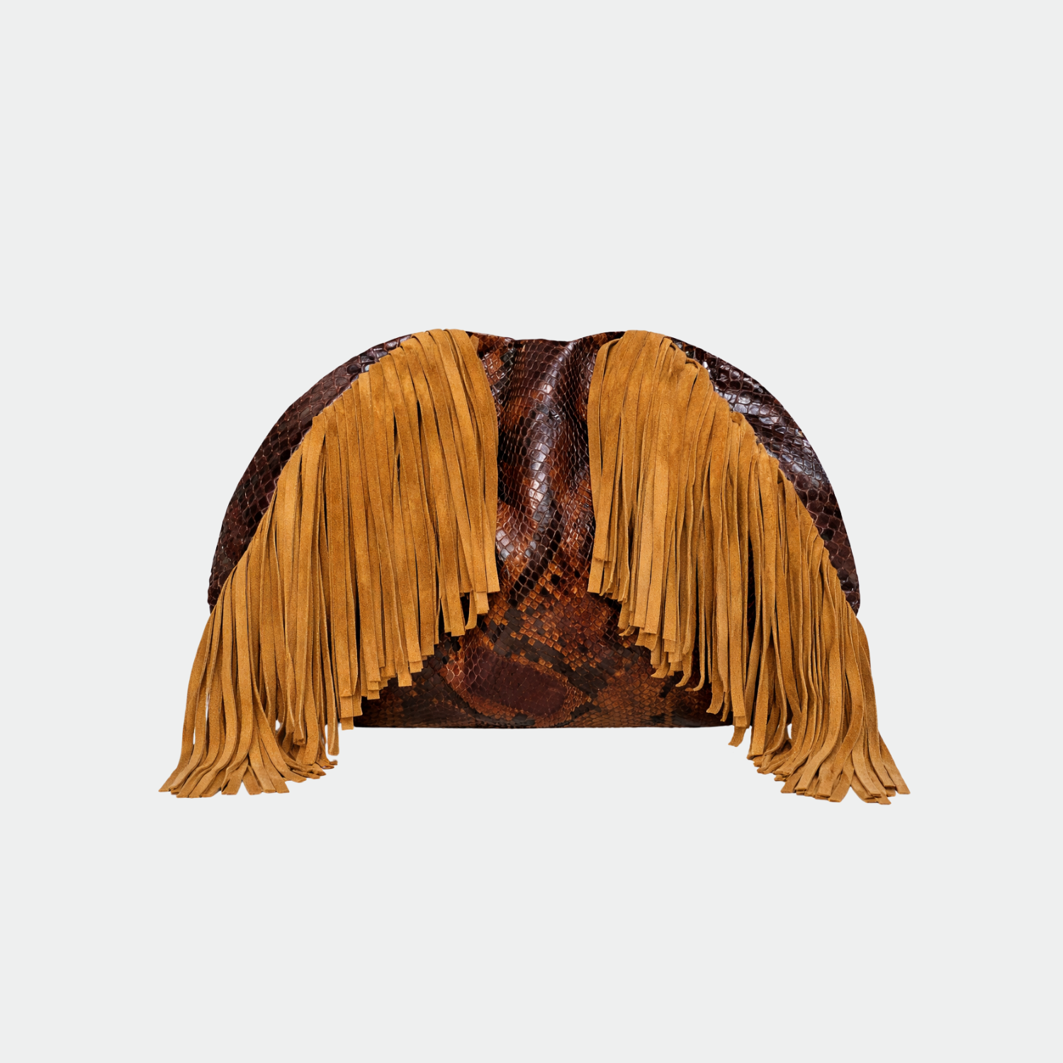 Soft python clutch with cotton lining and magnetic closure. Single compartment with small pocket. Gold-tone metal hardware. Removable python shoulder strap.