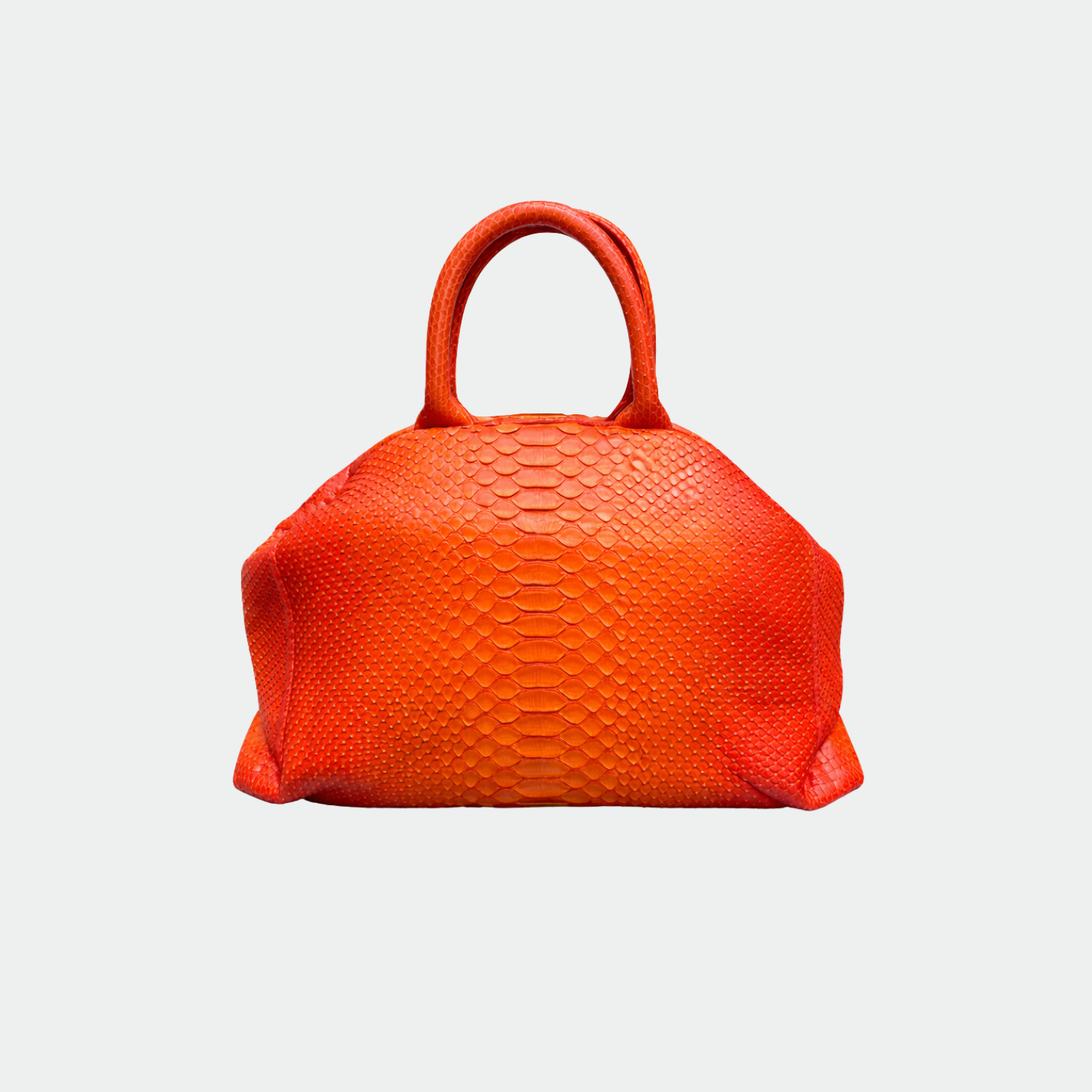 Soft python bag with cotton lining, rigid handles and magnetic closure. Single compartment with small pocket. Removable python shoulder strap.