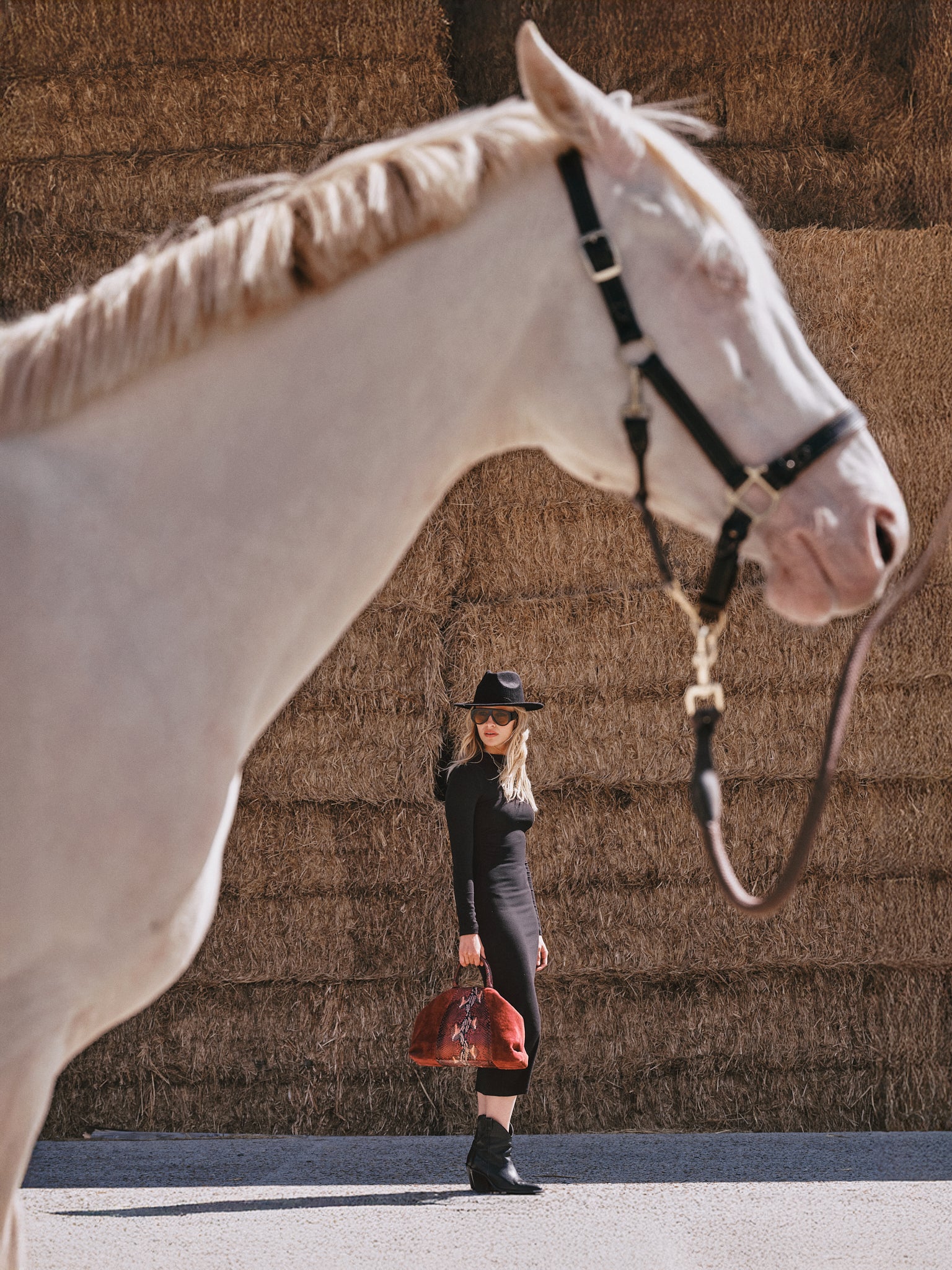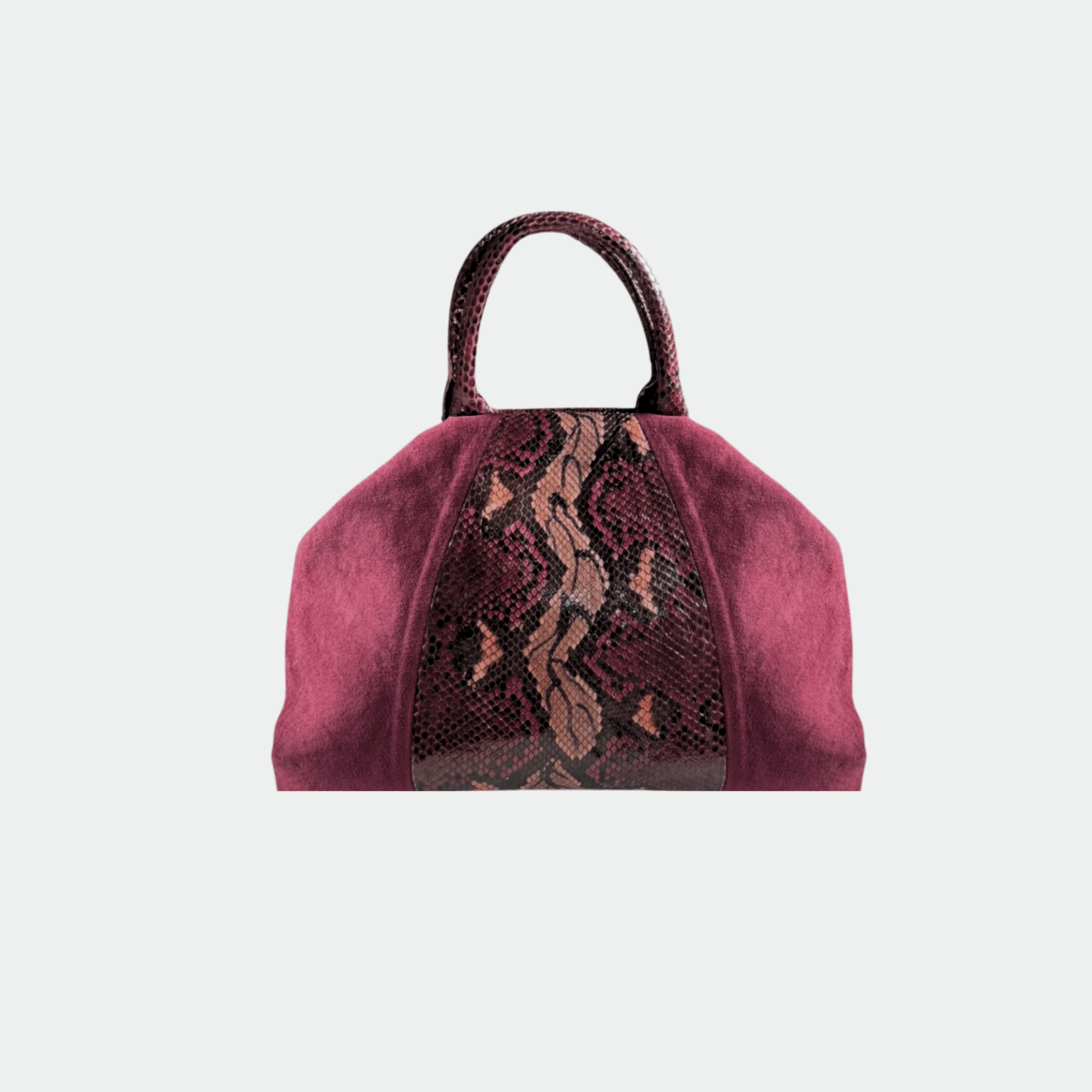 Soft nubuck bag with python leather center with cotton interior lining, rigid handles and magnetic closure. Single compartment with small pocket. Removable python shoulder strap.