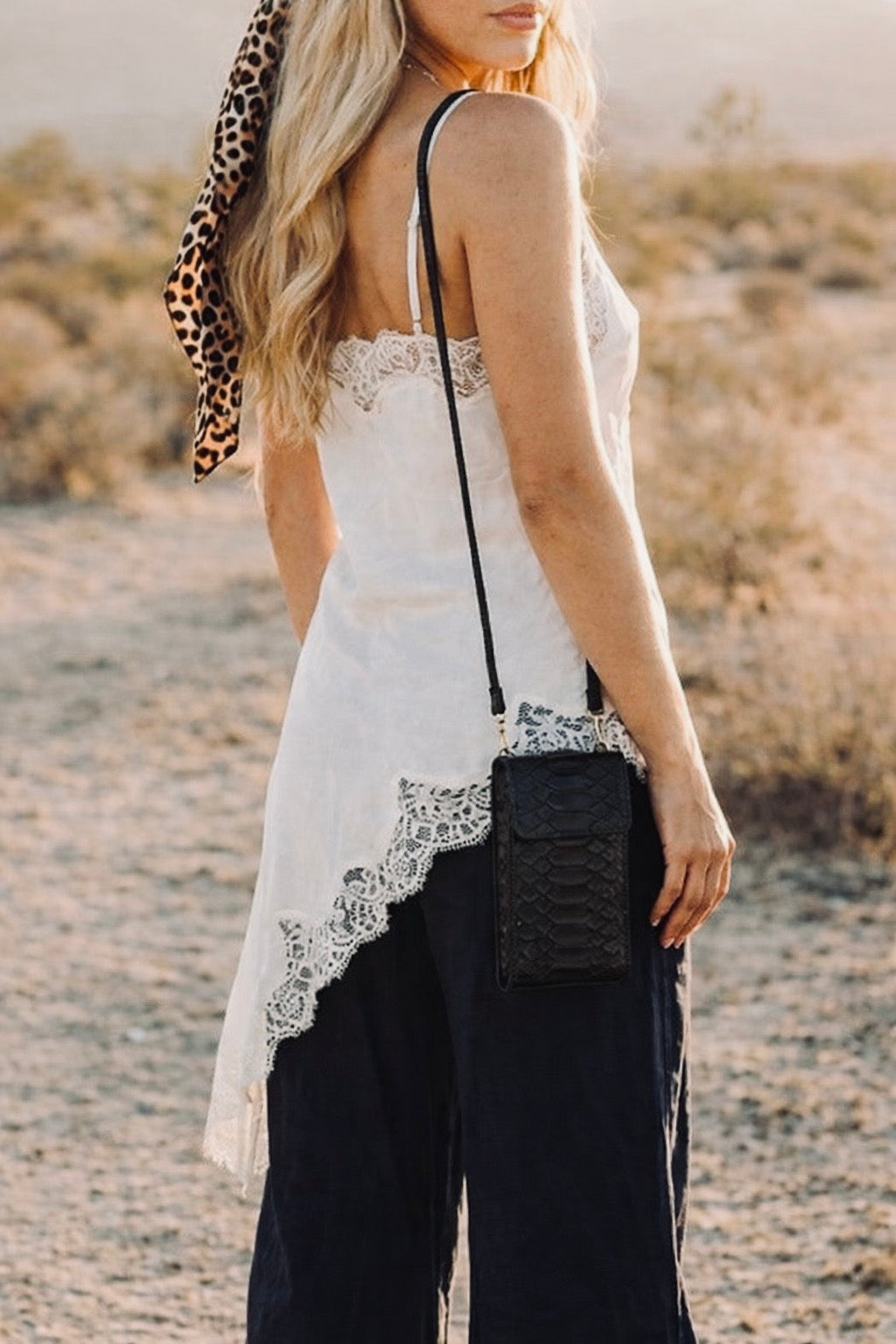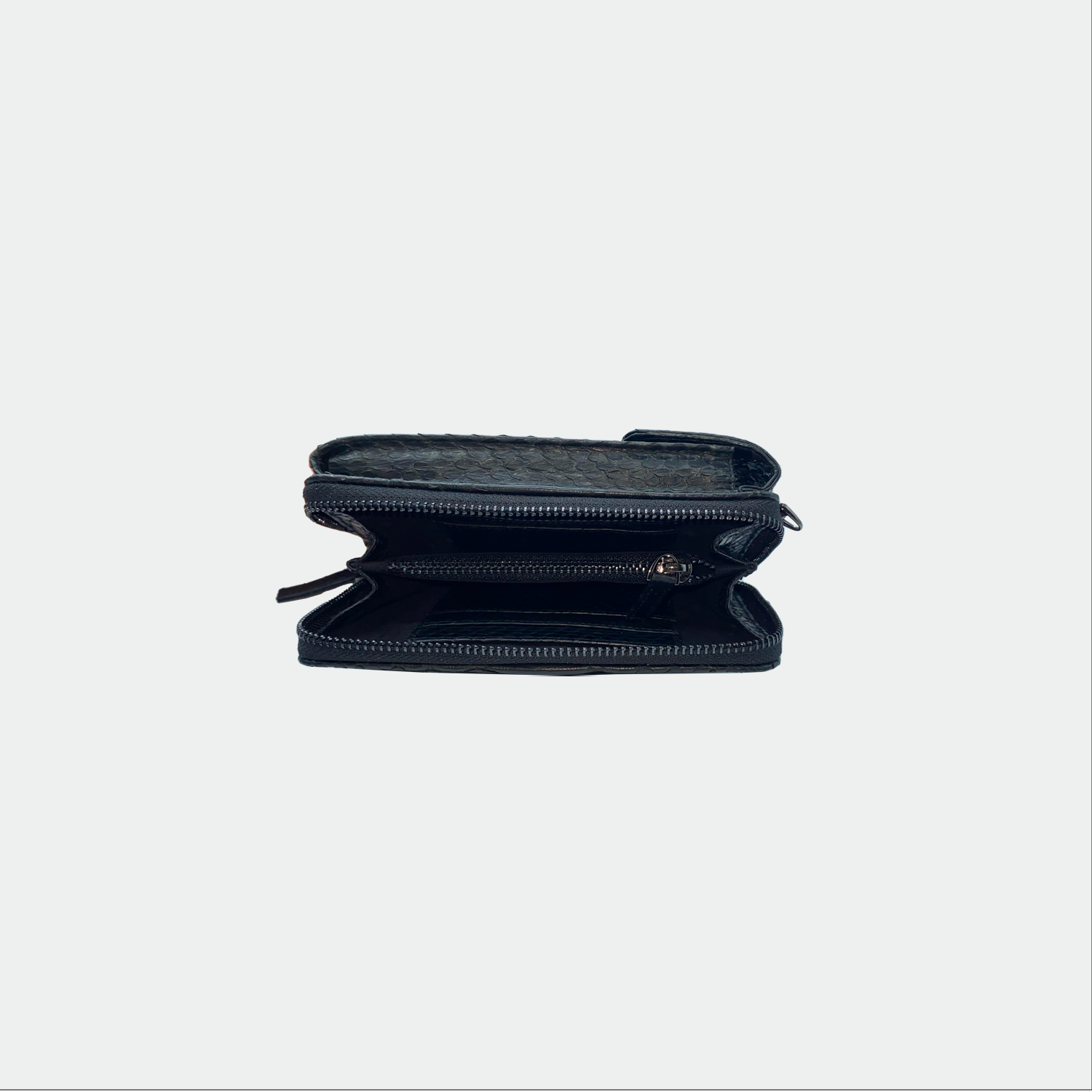 Python clutch bag with double compartment: wallet compartment and phone compartment. Black metallic finishes. Removable leather shoulder strap.