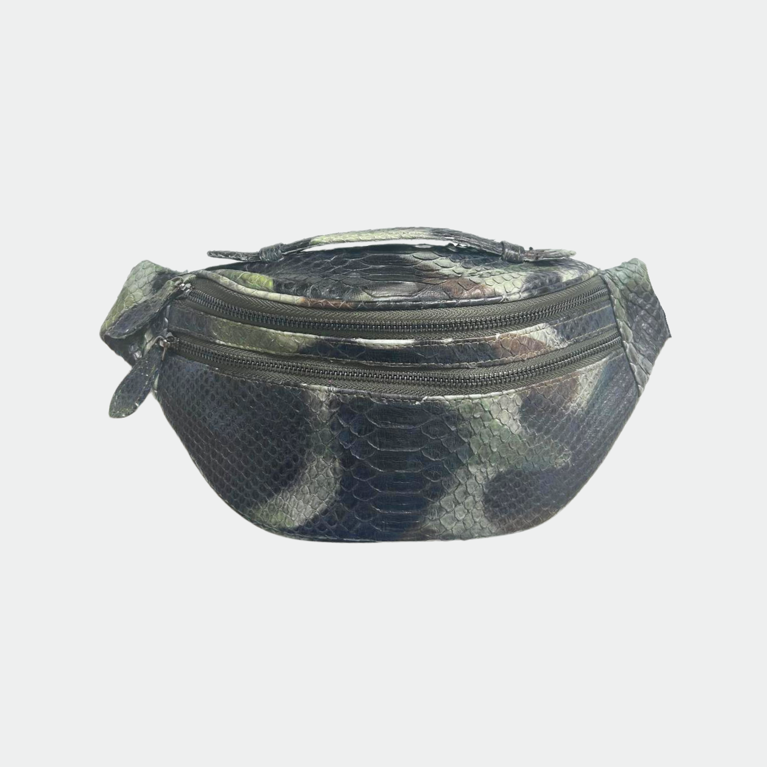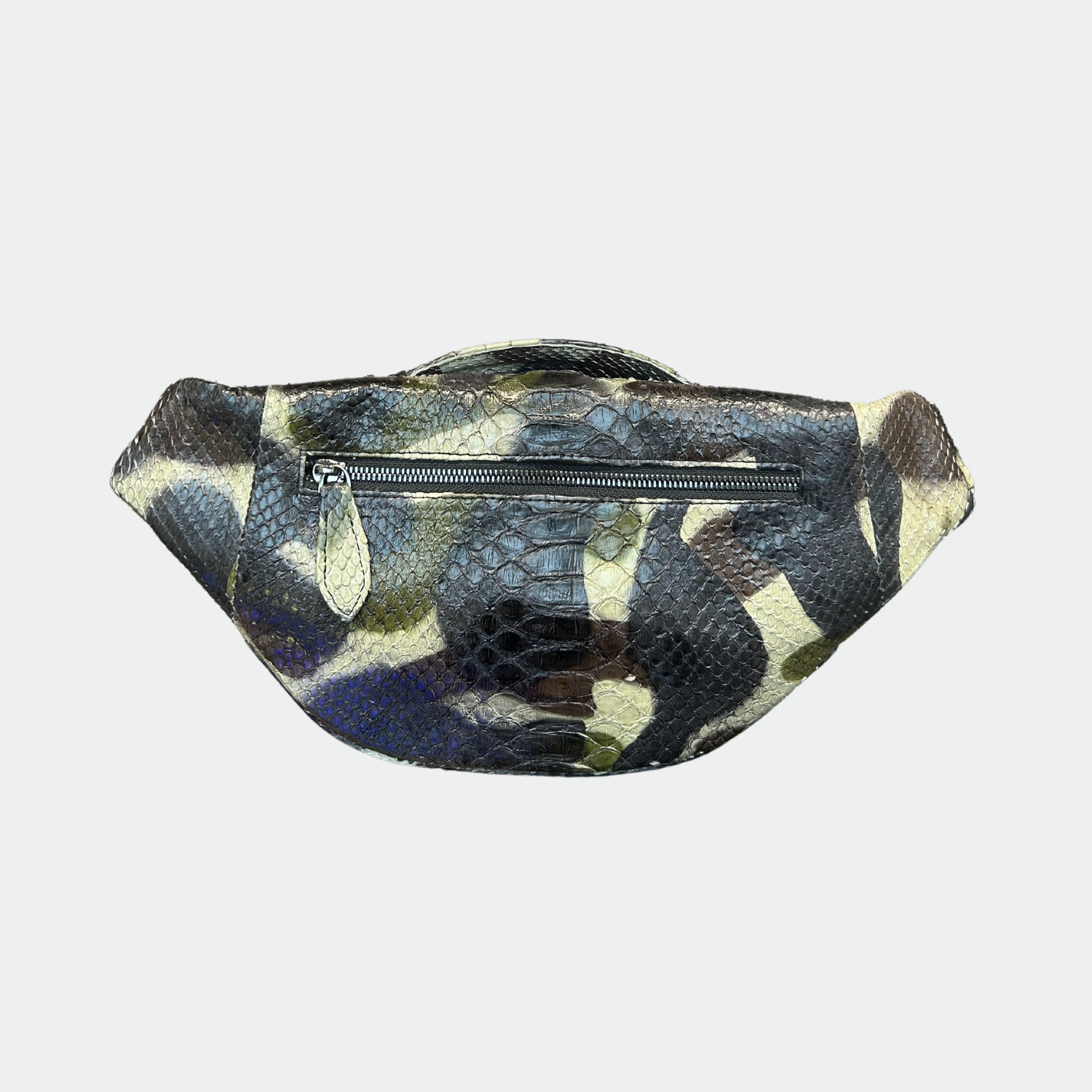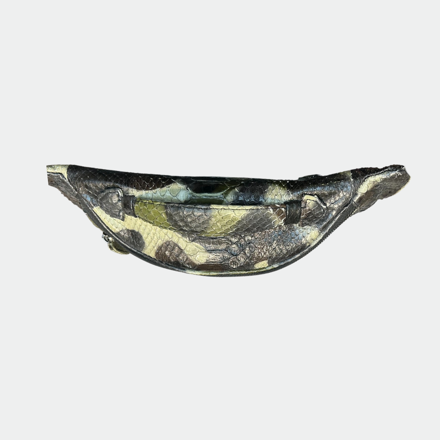 Python belt bag with cotton lining. Single compartment with zip closure and back pocket. Python shoulder strap.