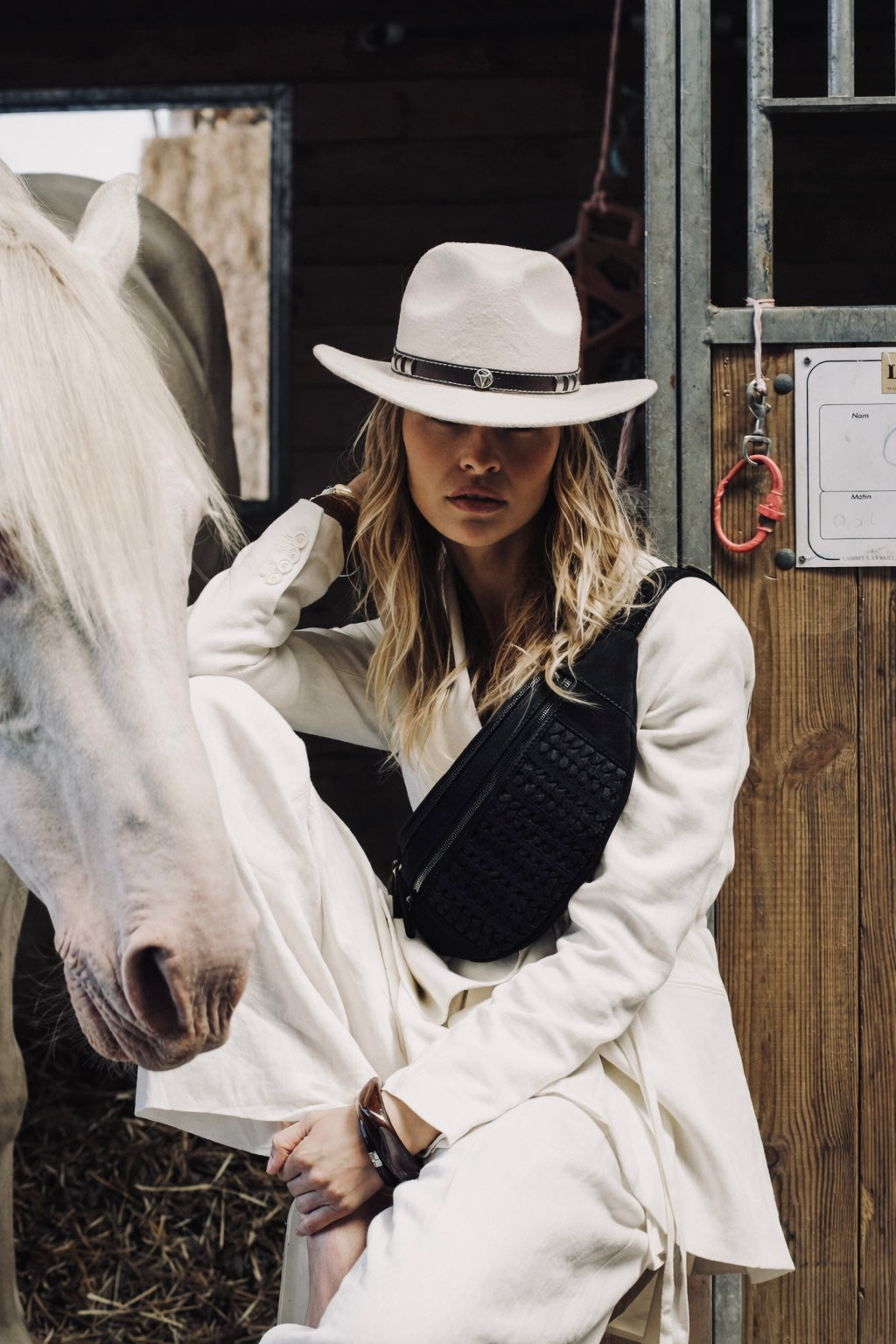 Nubuck waist bag with cotton lining. Single compartment with zip closure and back pocket. Nubuck shoulder strap. Gunmetal hardware.