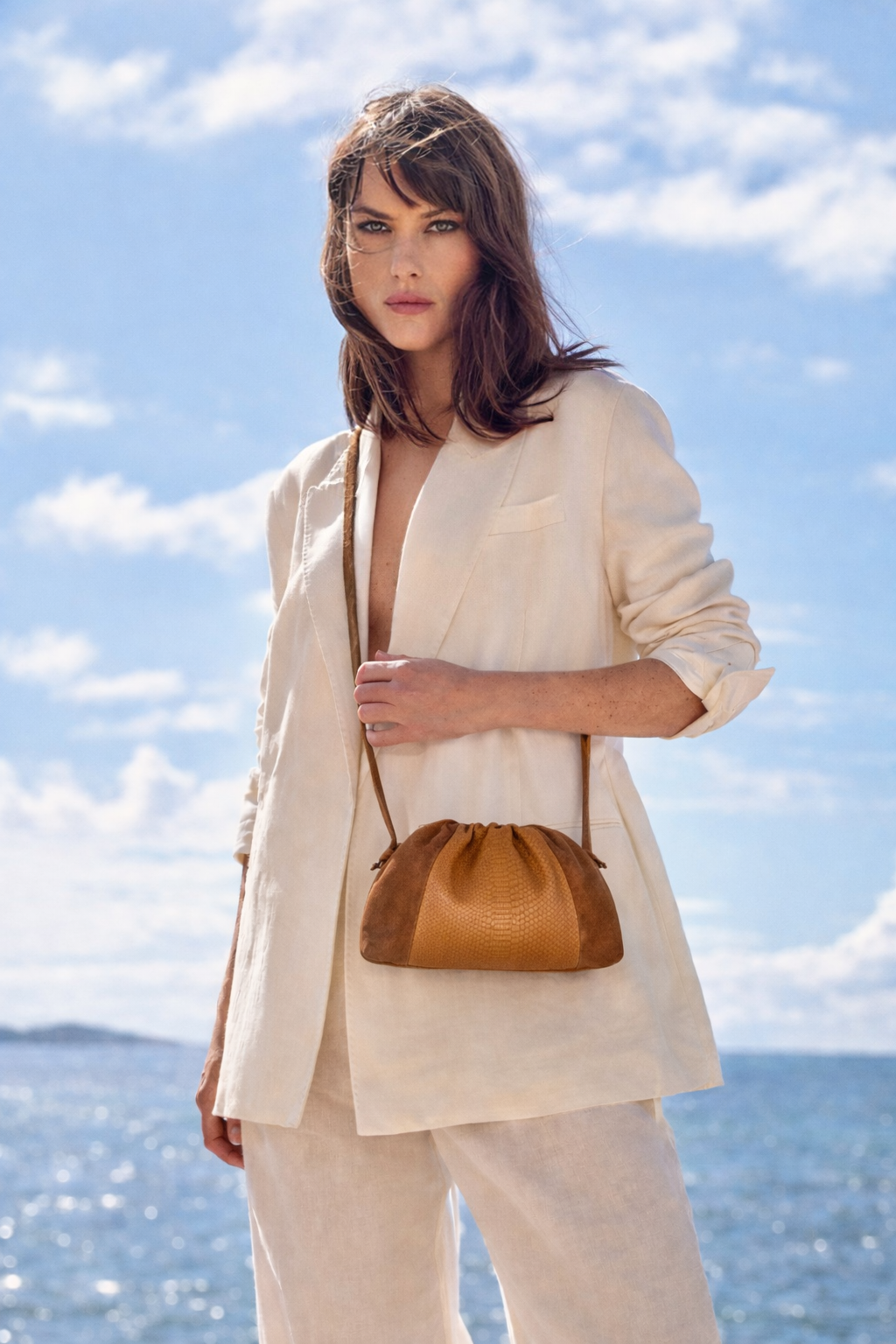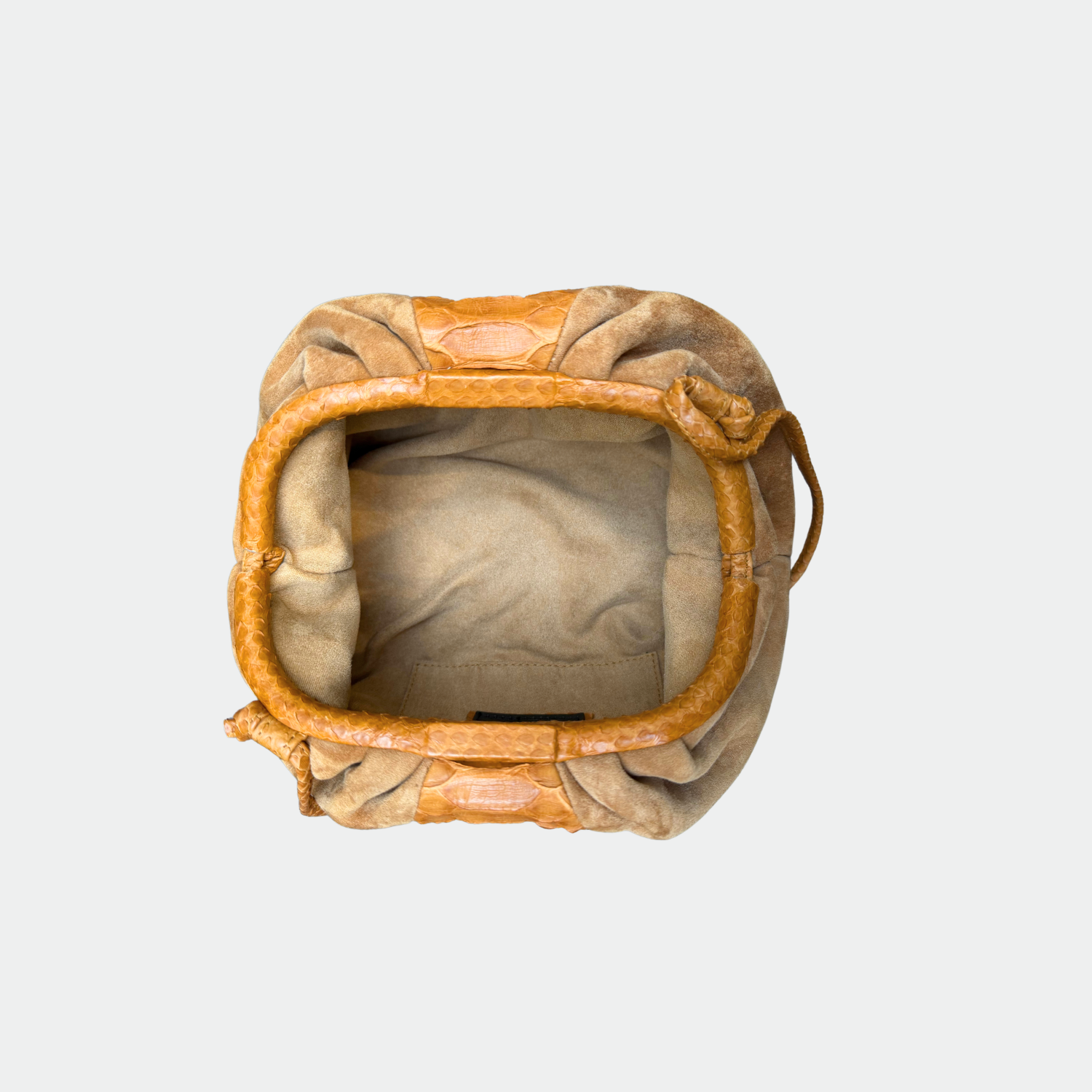 Soft pouch in suede-effect calfskin with a python leather center, with cotton lining and magnetic closure. Single compartment with small pocket.