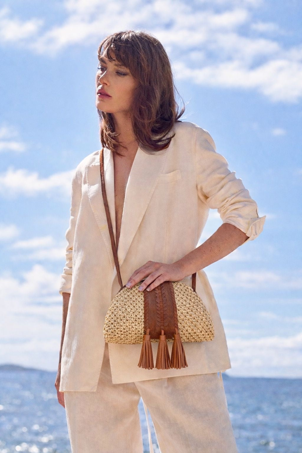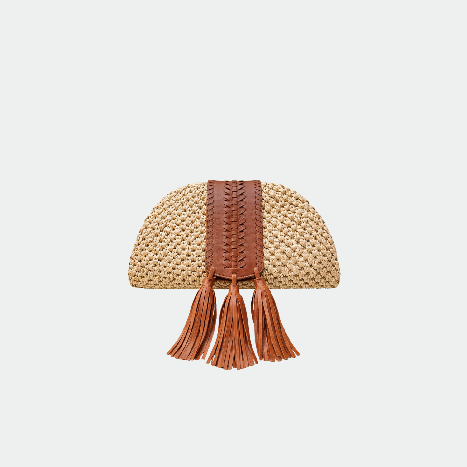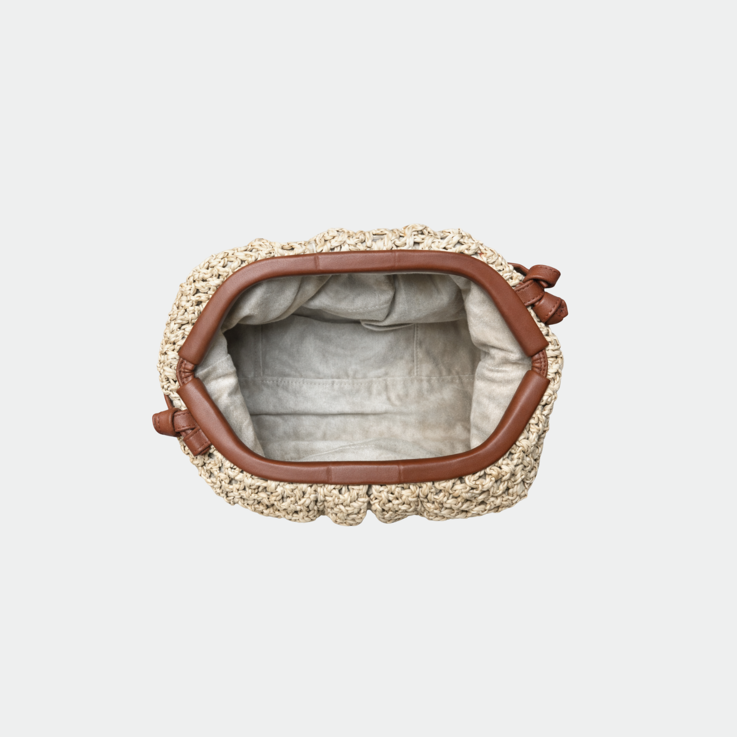 Soft crochet pouch with leather insert, cotton lining and magnetic closure. Compartment
