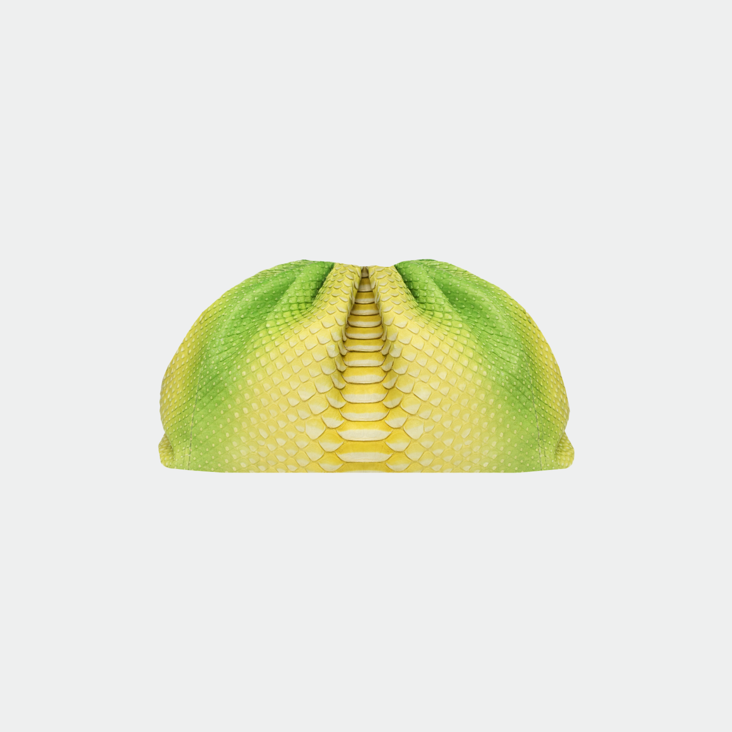 Soft pouch in suede-effect calfskin on the sides and python leather in the middle, with cotton interior lining and magnetic closure. Single compartment with small pocket. Gold-tone metal hardware. Removable calfskin shoulder strap.