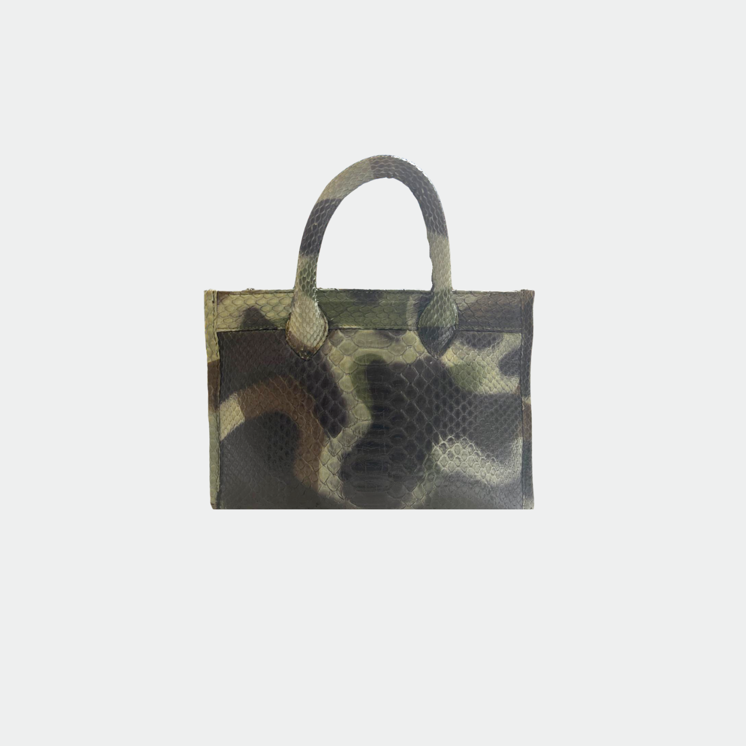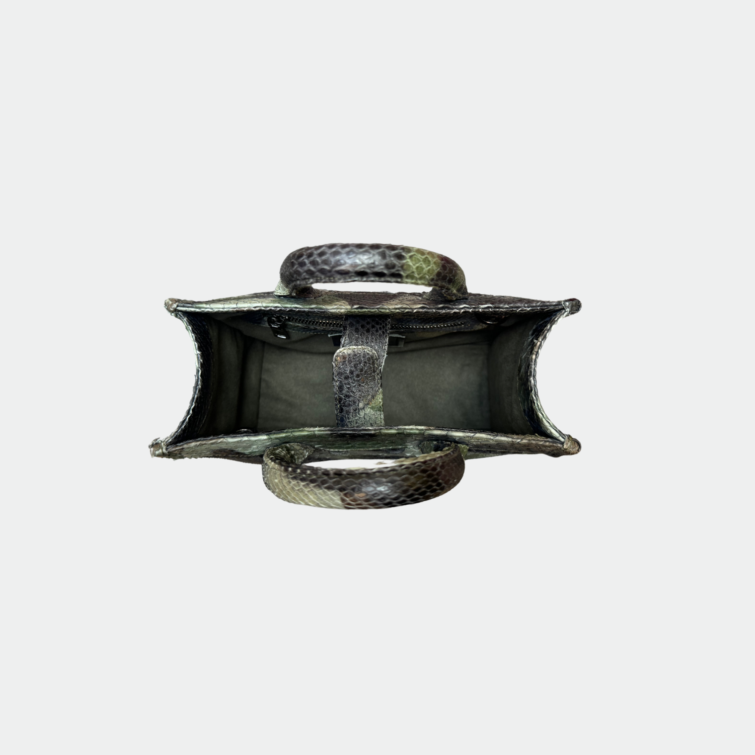 Sac en python, avec doublure intérieure en coton et anses rigides. Un compartiment principal avec une petite poche et une poche zippée. Bandoulière amovible en python.