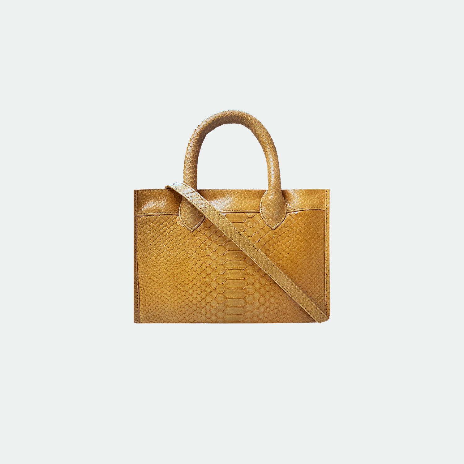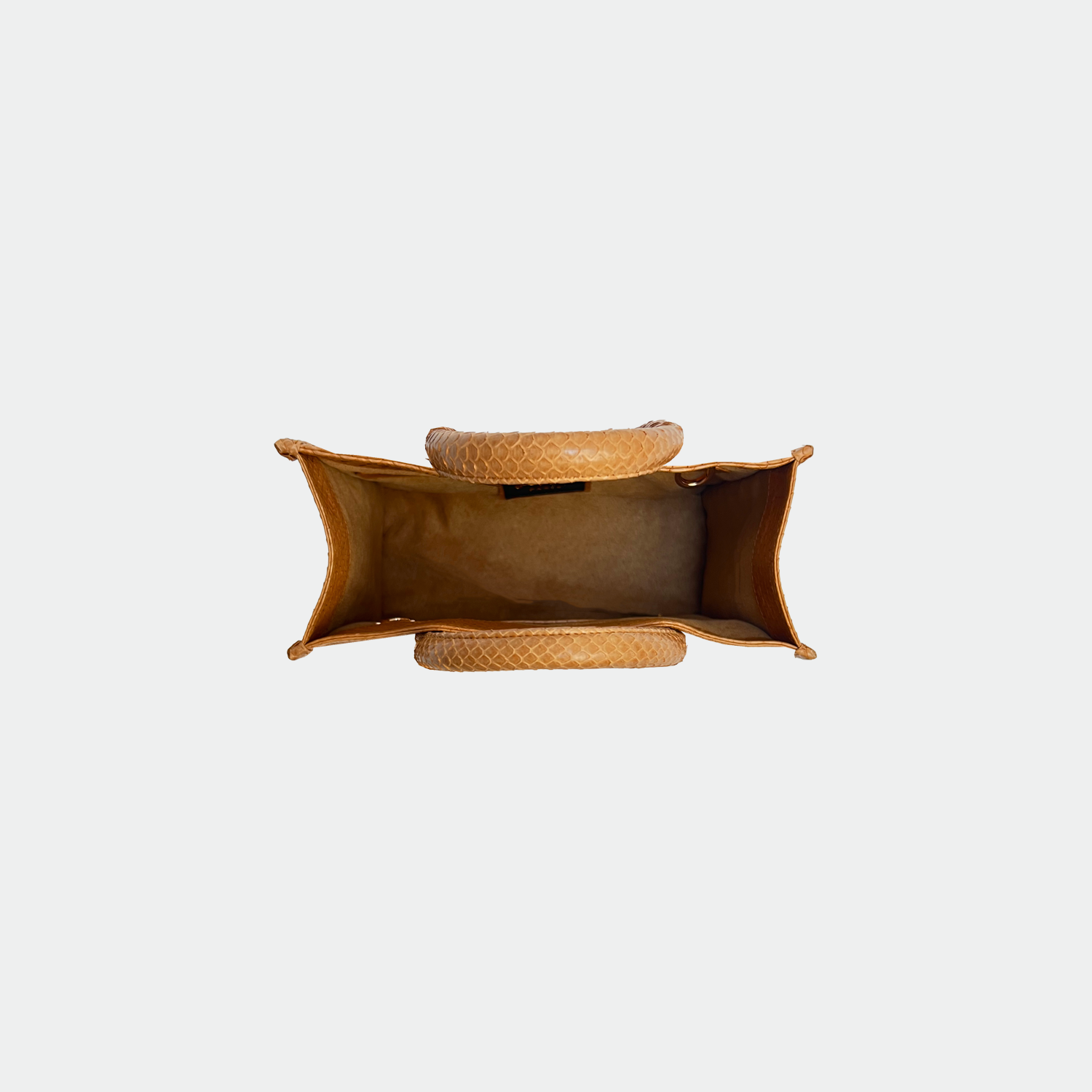 Sac en python, avec doublure intérieure en coton et anses rigides. Un compartiment principal avec une petite poche et une poche zippée. Bandoulière amovible en python.