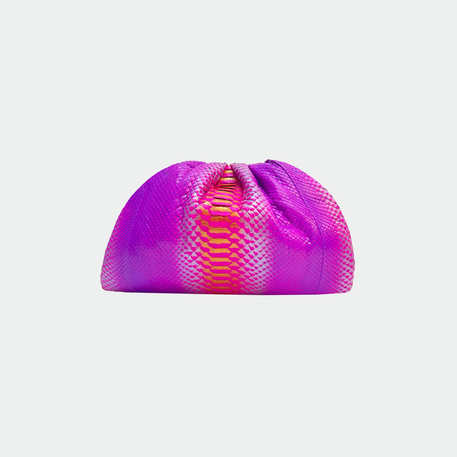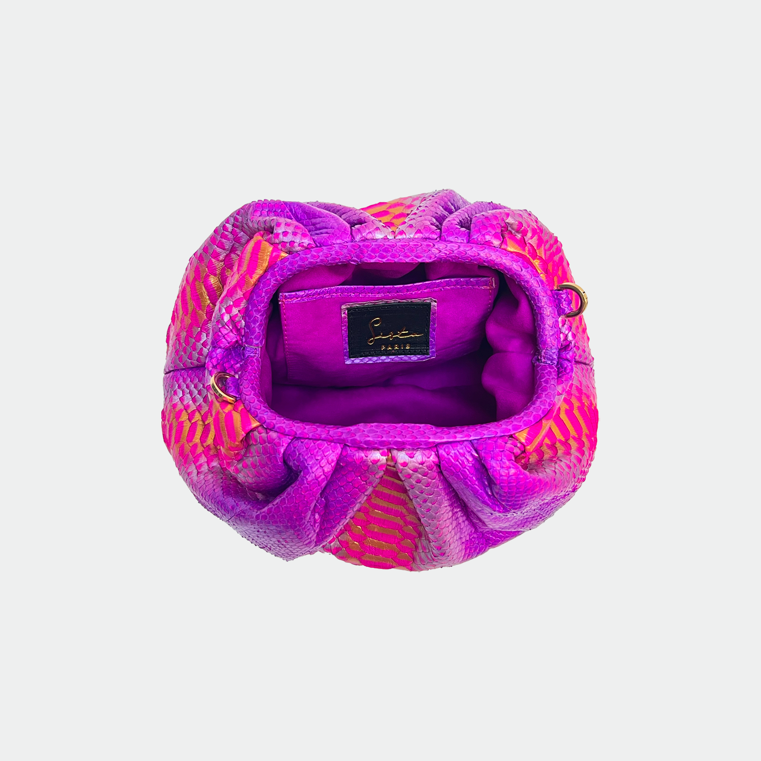 Pochette souple en python, avec doublure intérieure en coton et fermeture magnétique. Compartiment unique avec petite poche. Finitions métalliques couleur or. Bandoulière amovible en python.