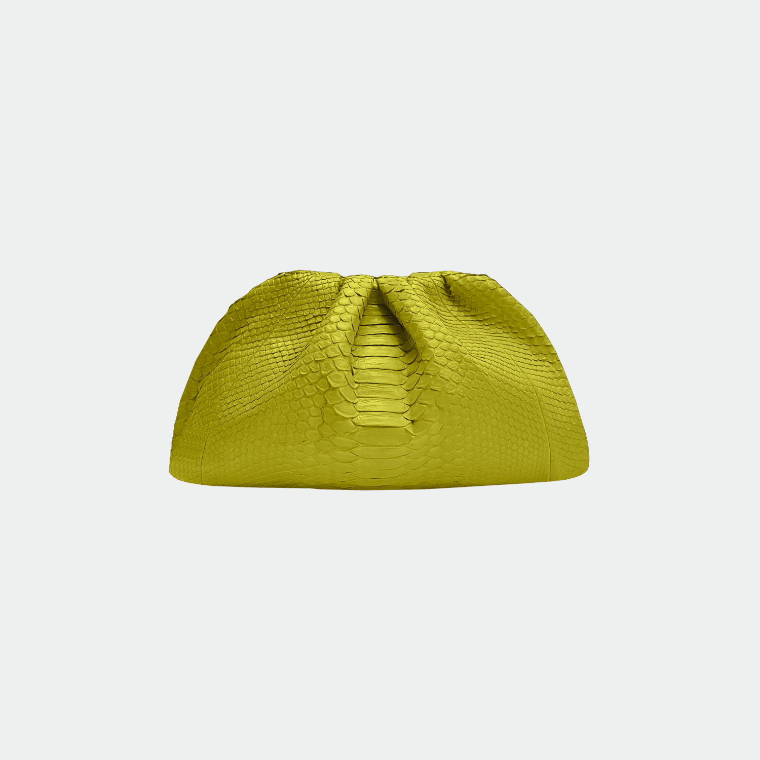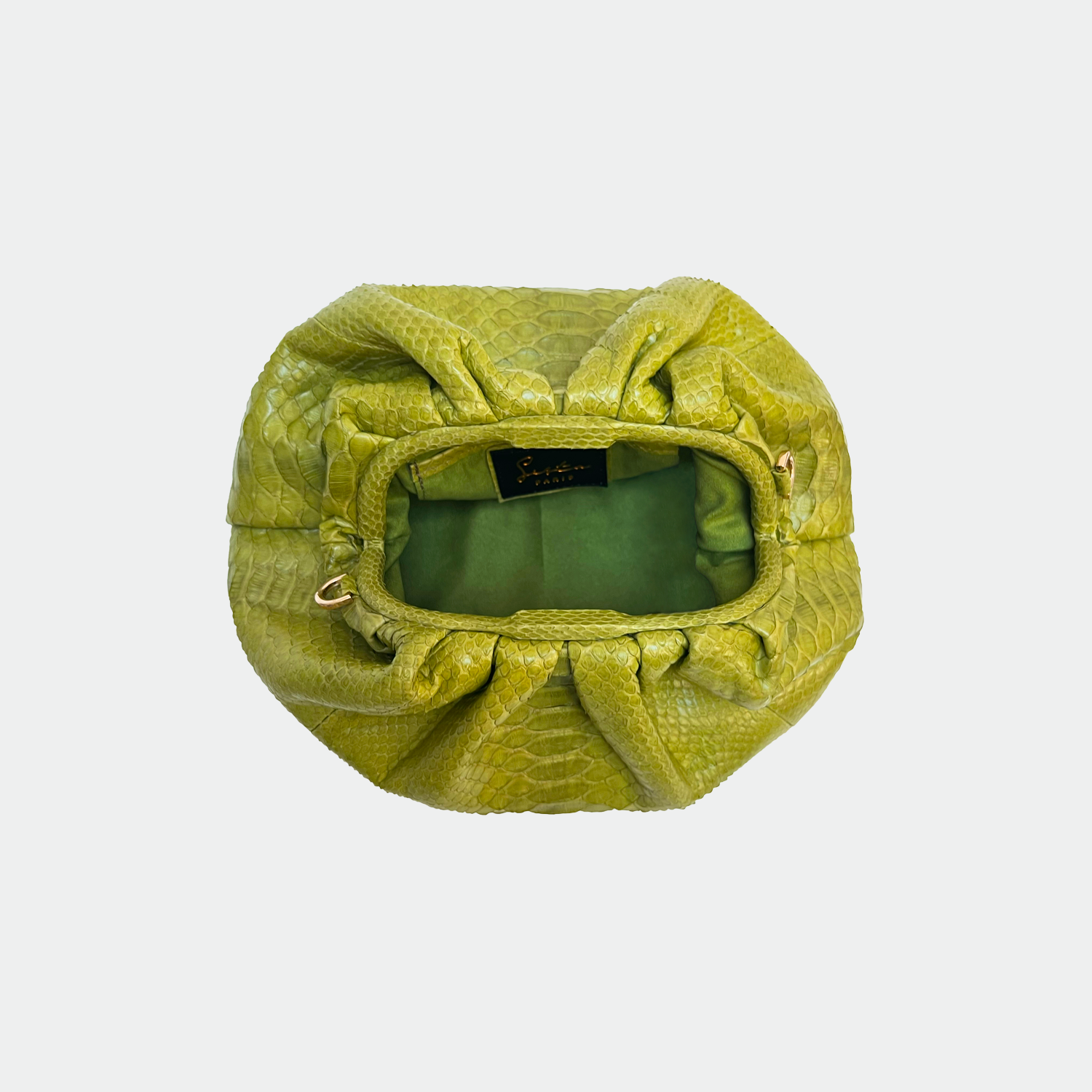 Pochette souple en python, avec doublure intérieure en coton et fermeture magnétique. Compartiment unique avec petite poche. Finitions métalliques couleur or. Bandoulière amovible en python.