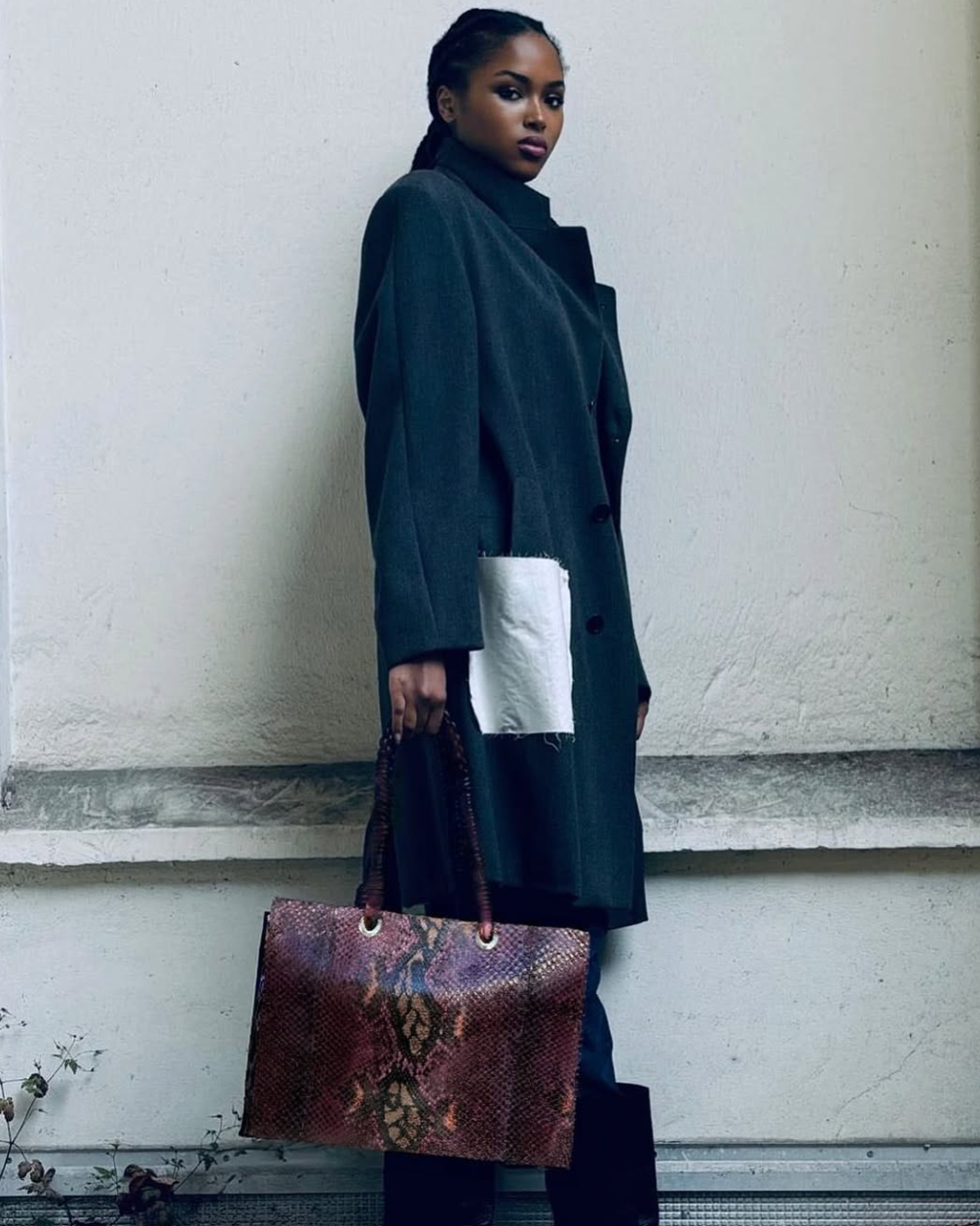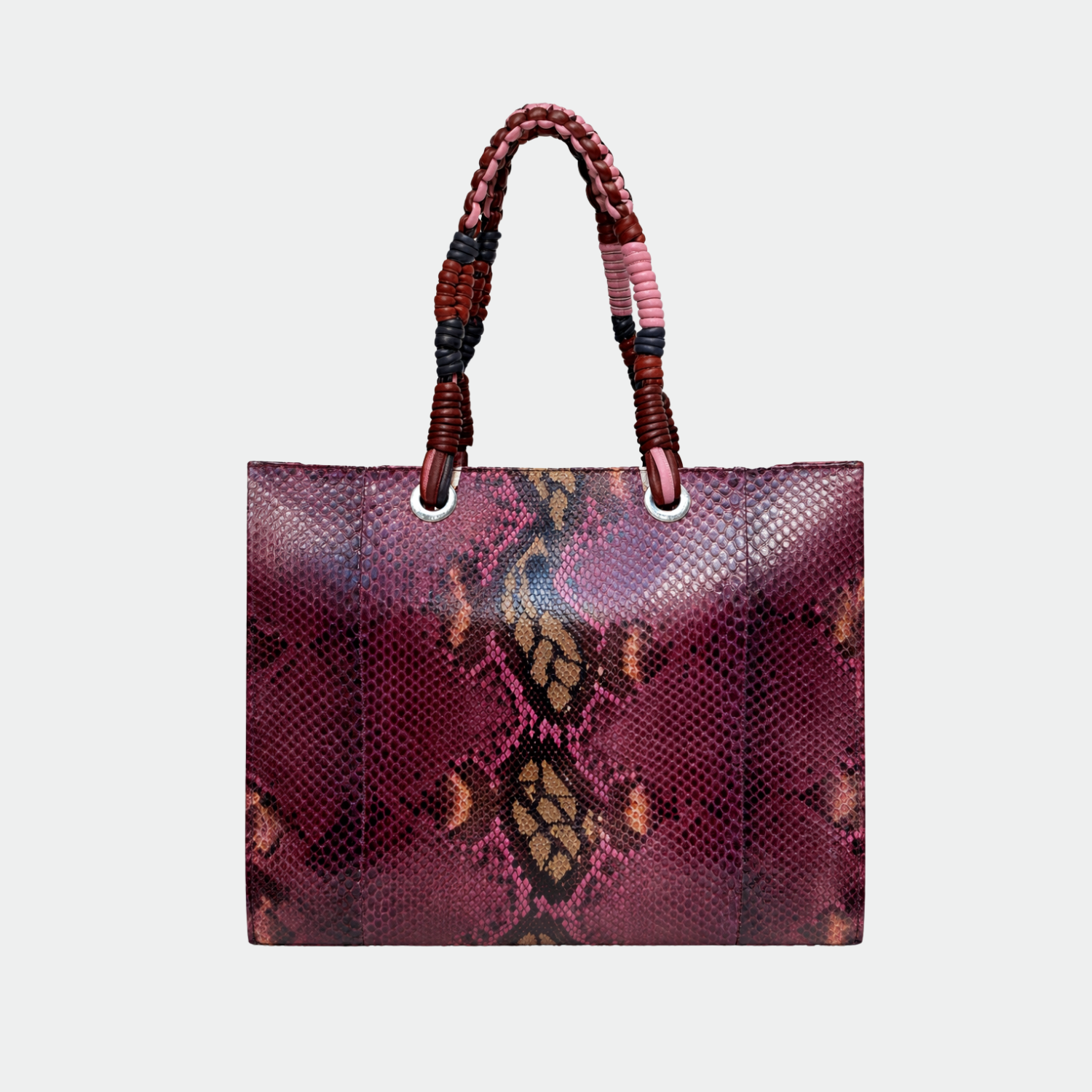 Sac en python, avec doublure intérieure en coton et anses tressées. Compartiment