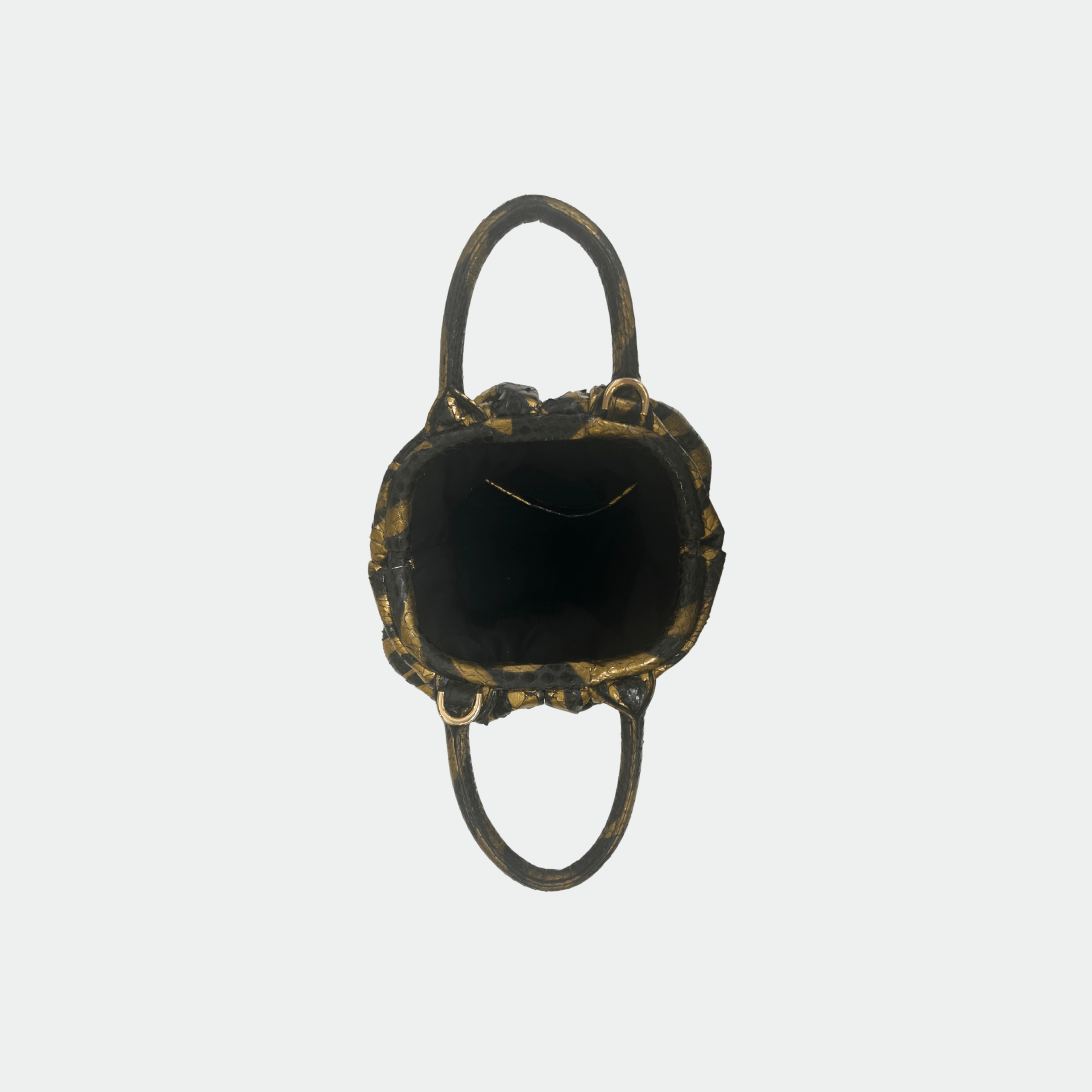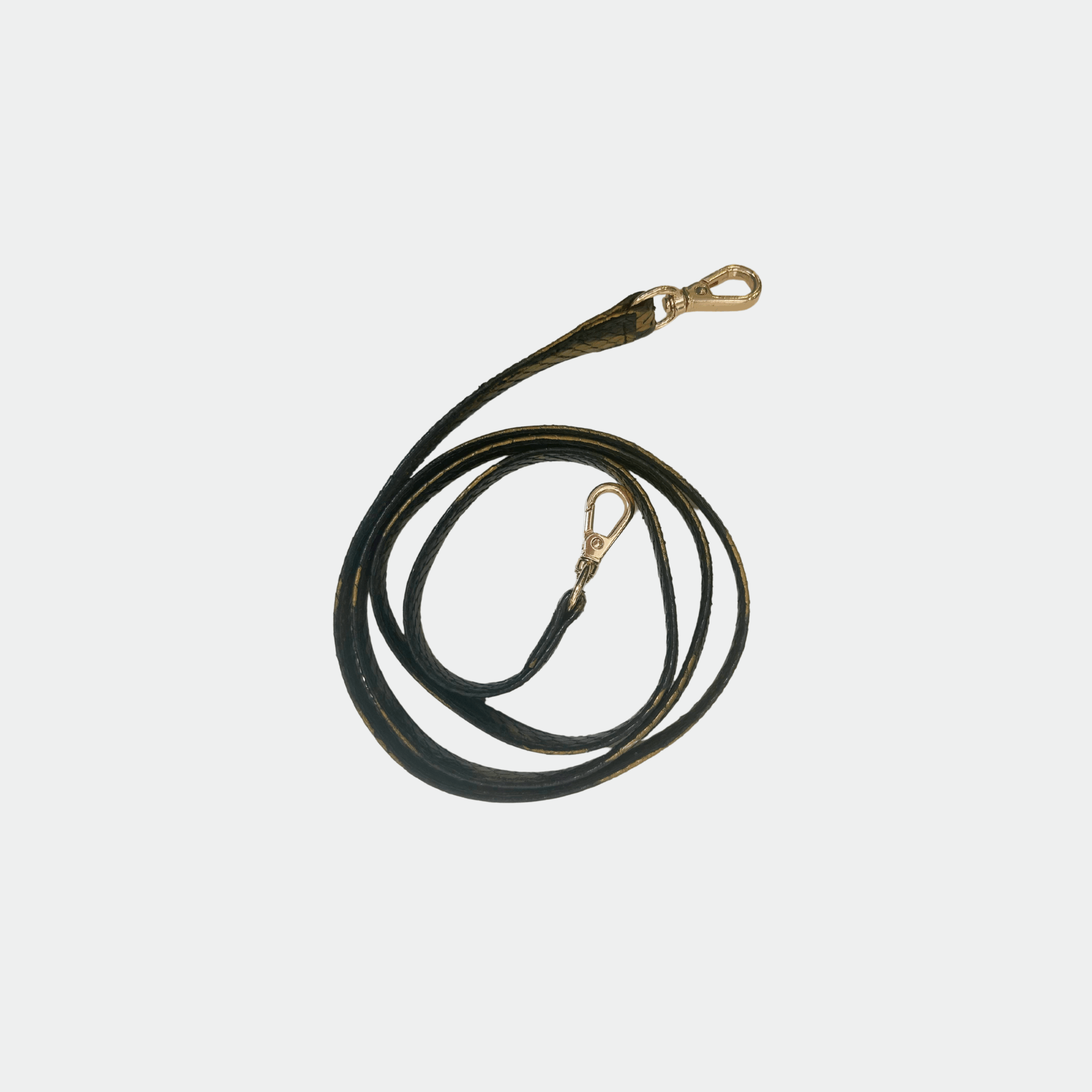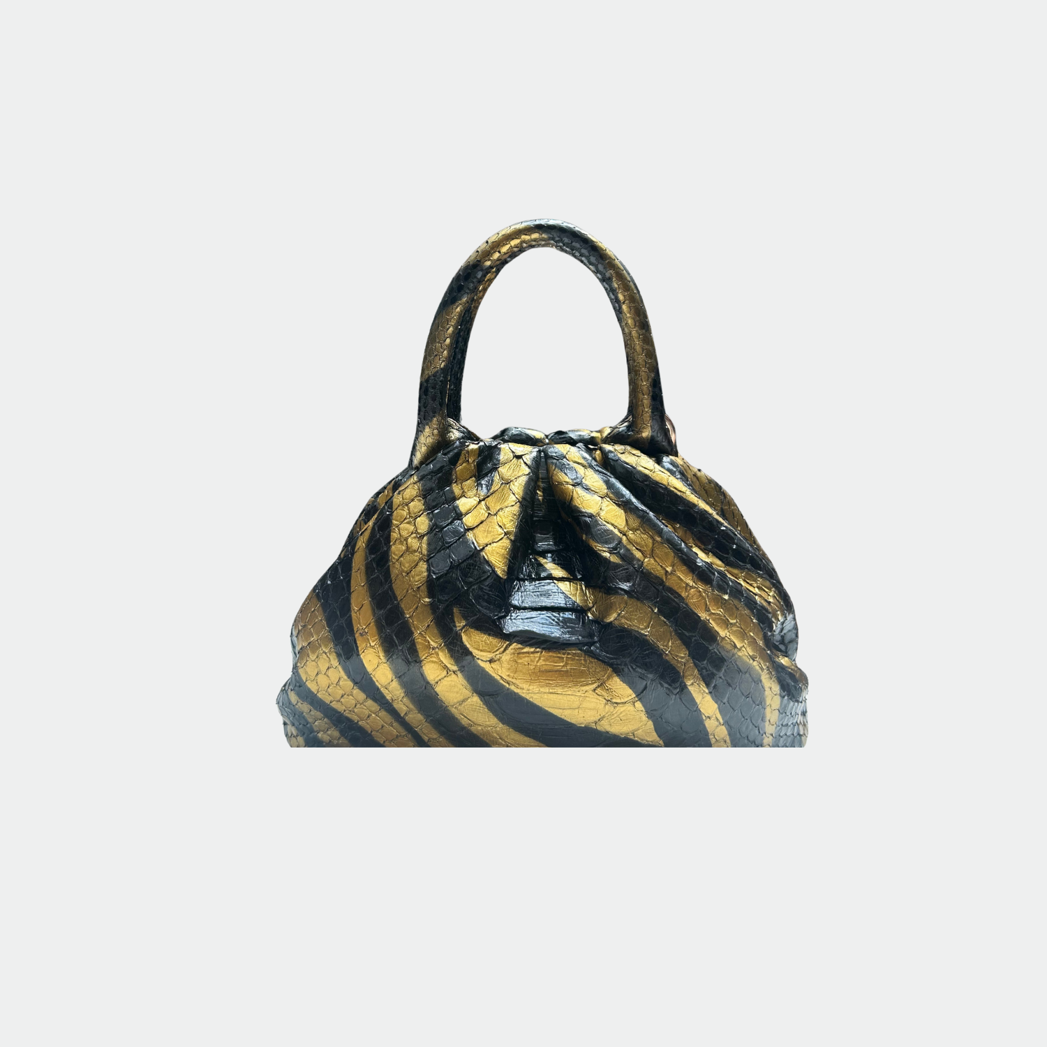 Pochette souple en python, avec doublure intérieure en coton et fermeture magnétique. Compartiment unique avec petite poche. Finitions métalliques dorées. Bandoulière amovible en python.
