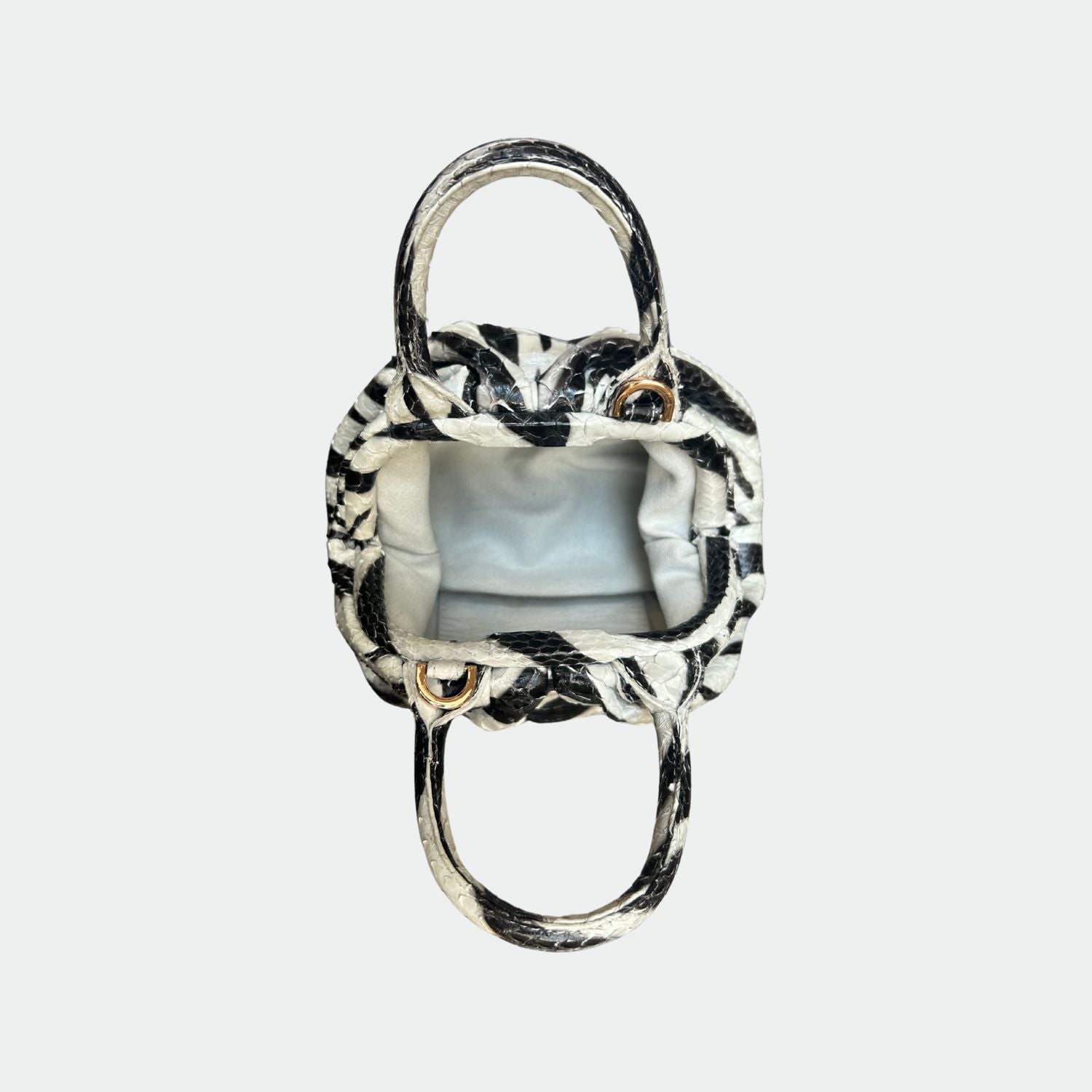 Pochette souple en python, avec doublure intérieure en coton et fermeture magnétique. Compartiment unique avec petite poche. Finitions métalliques dorées. Bandoulière amovible en python.