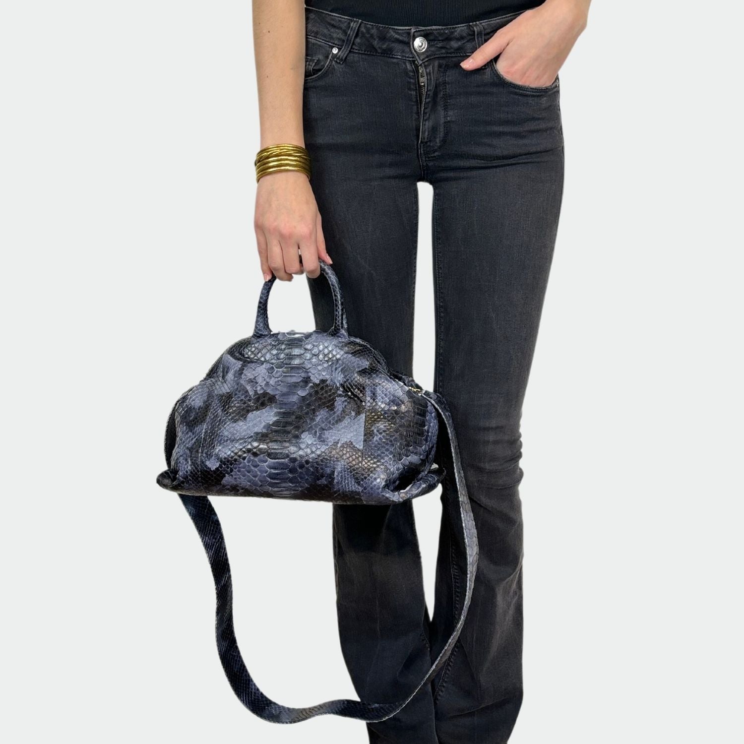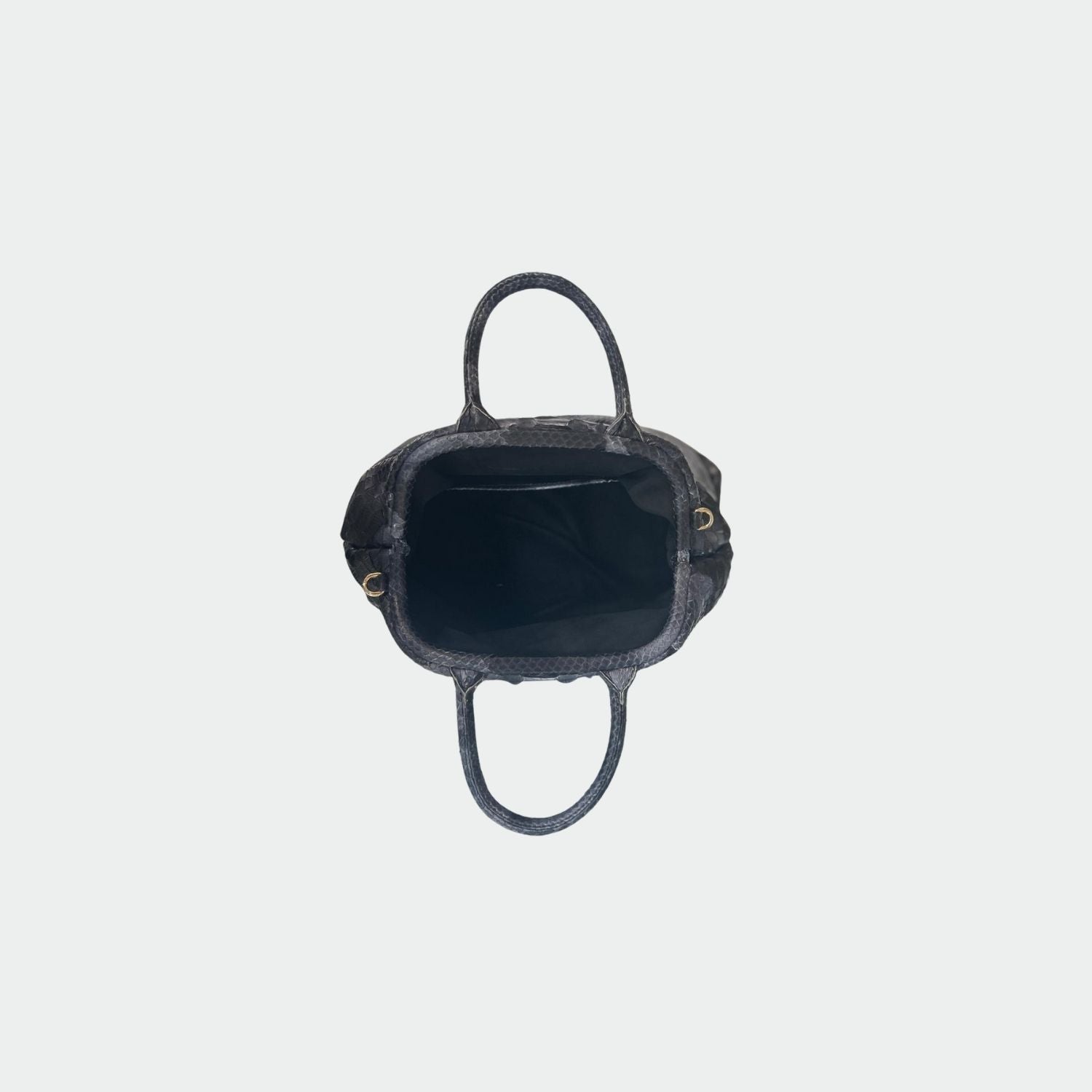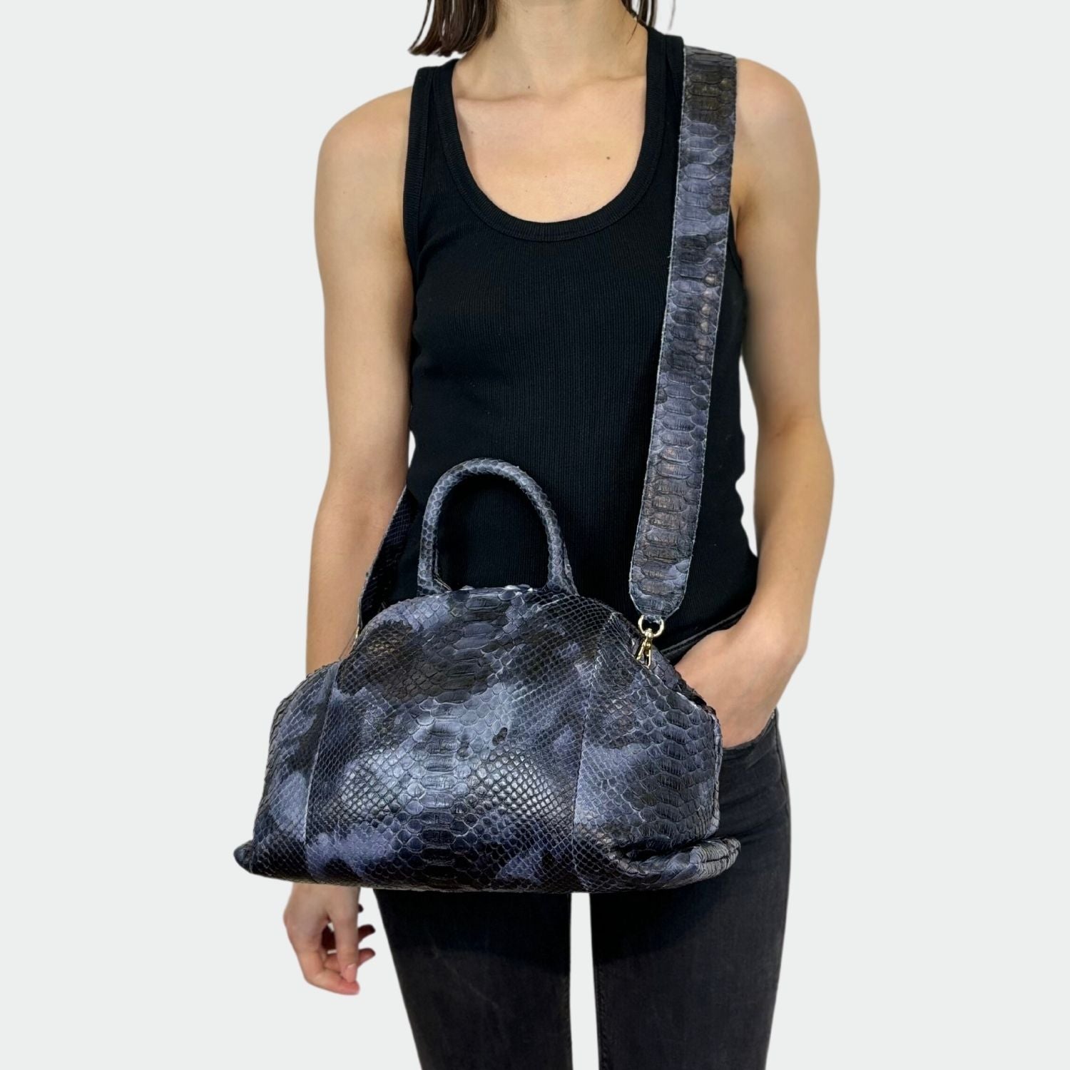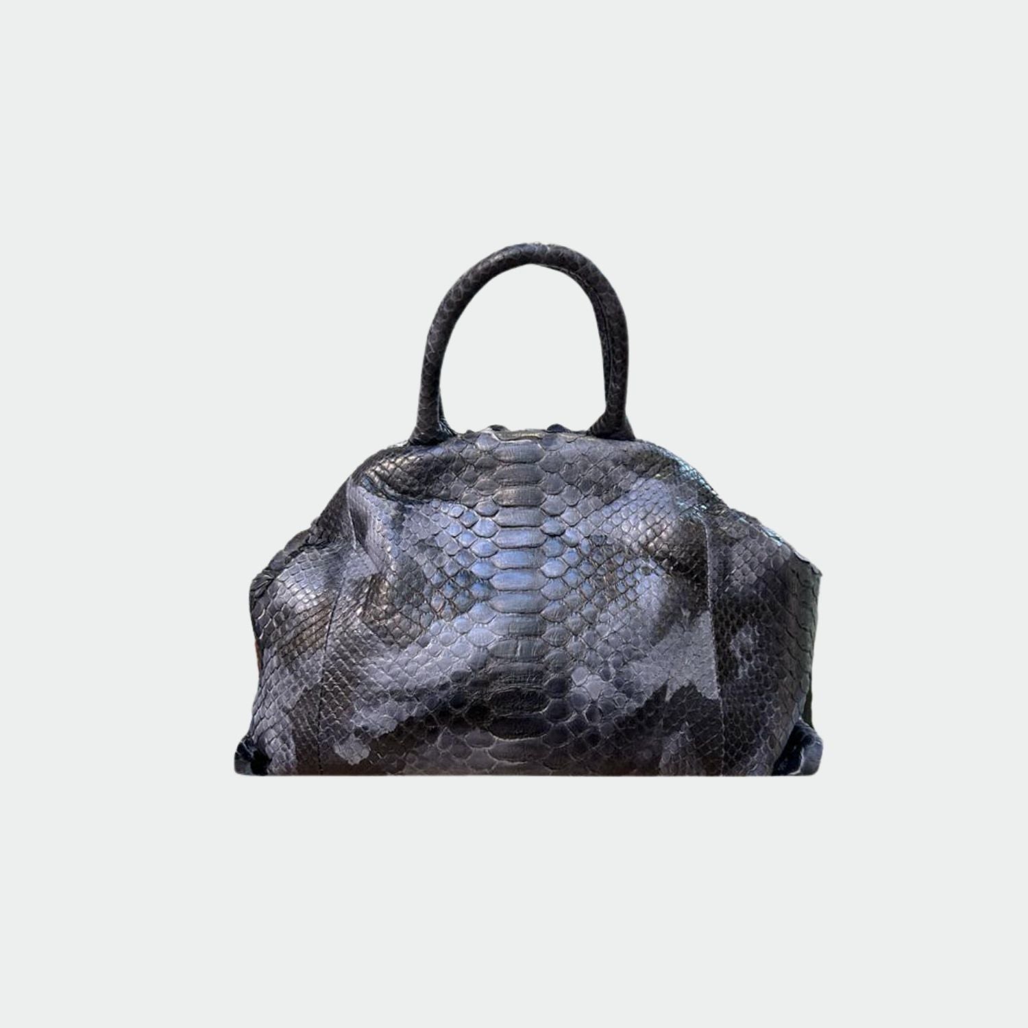 Sac souple en python avec doublure intérieure en coton, anses rigides et fermeture magnétique. . Compartiment unique avec petite poche. Bandoulière amovible en python.