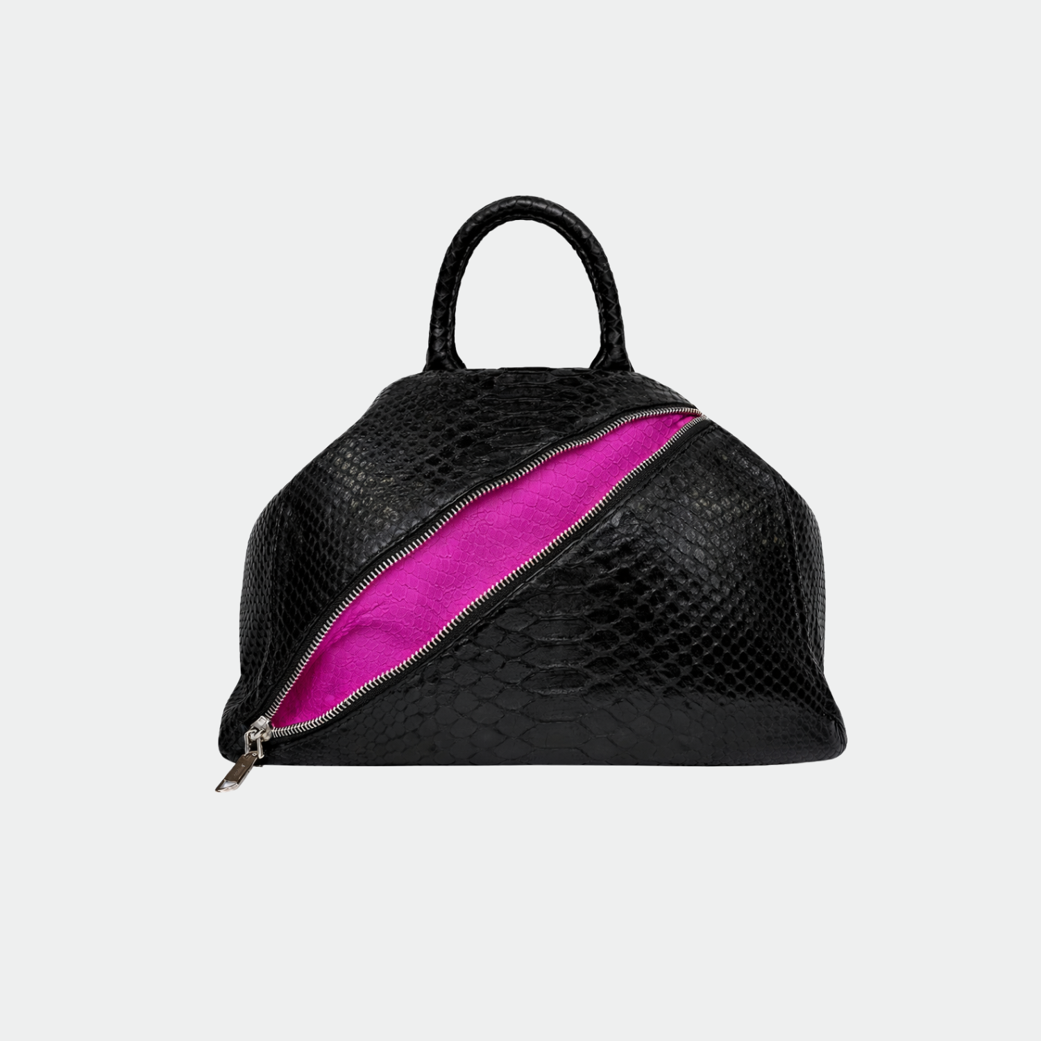 Sac souple en python avec doublure intérieure en coton, anses rigides et fermeture magnétique. . Compartiment unique avec petite poche. Bandoulière amovible en python.