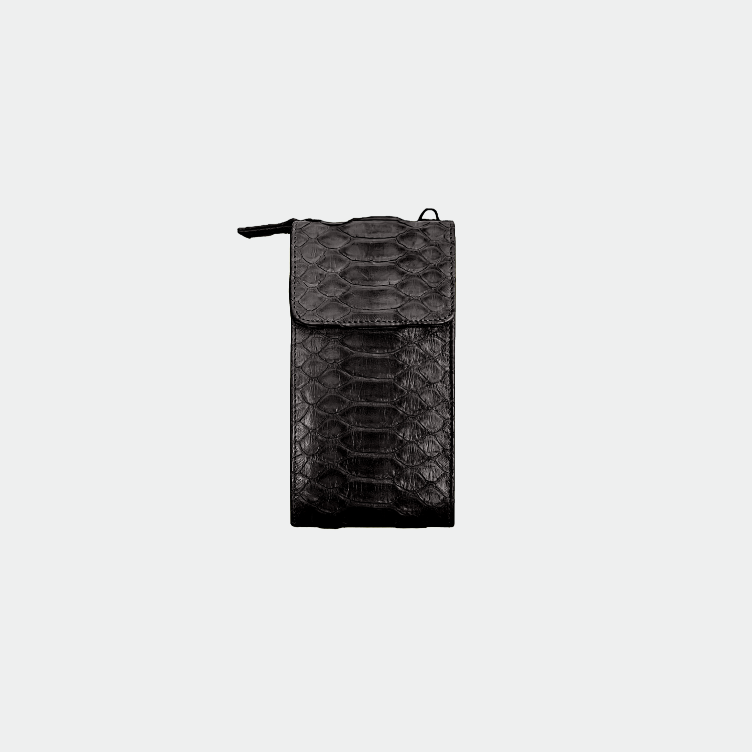 Pochette en python, avec double compartiment : compartiment portefeuille et compartiment téléphone. finitions métalliques couleur noir. Bandoulière amovible en cuir.
