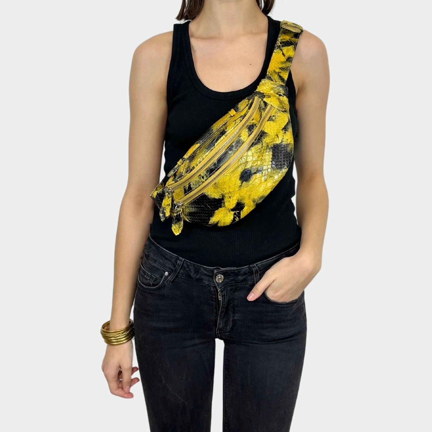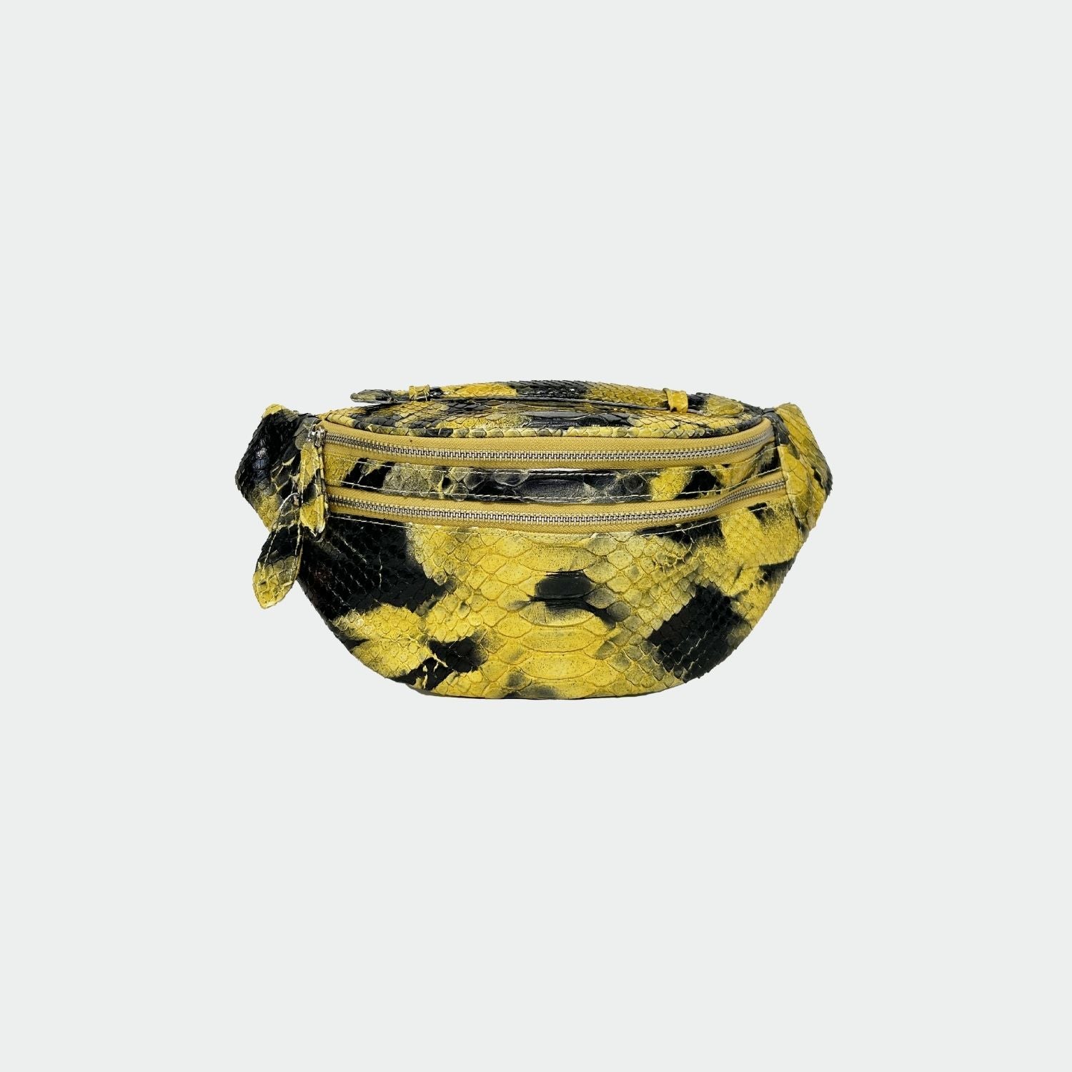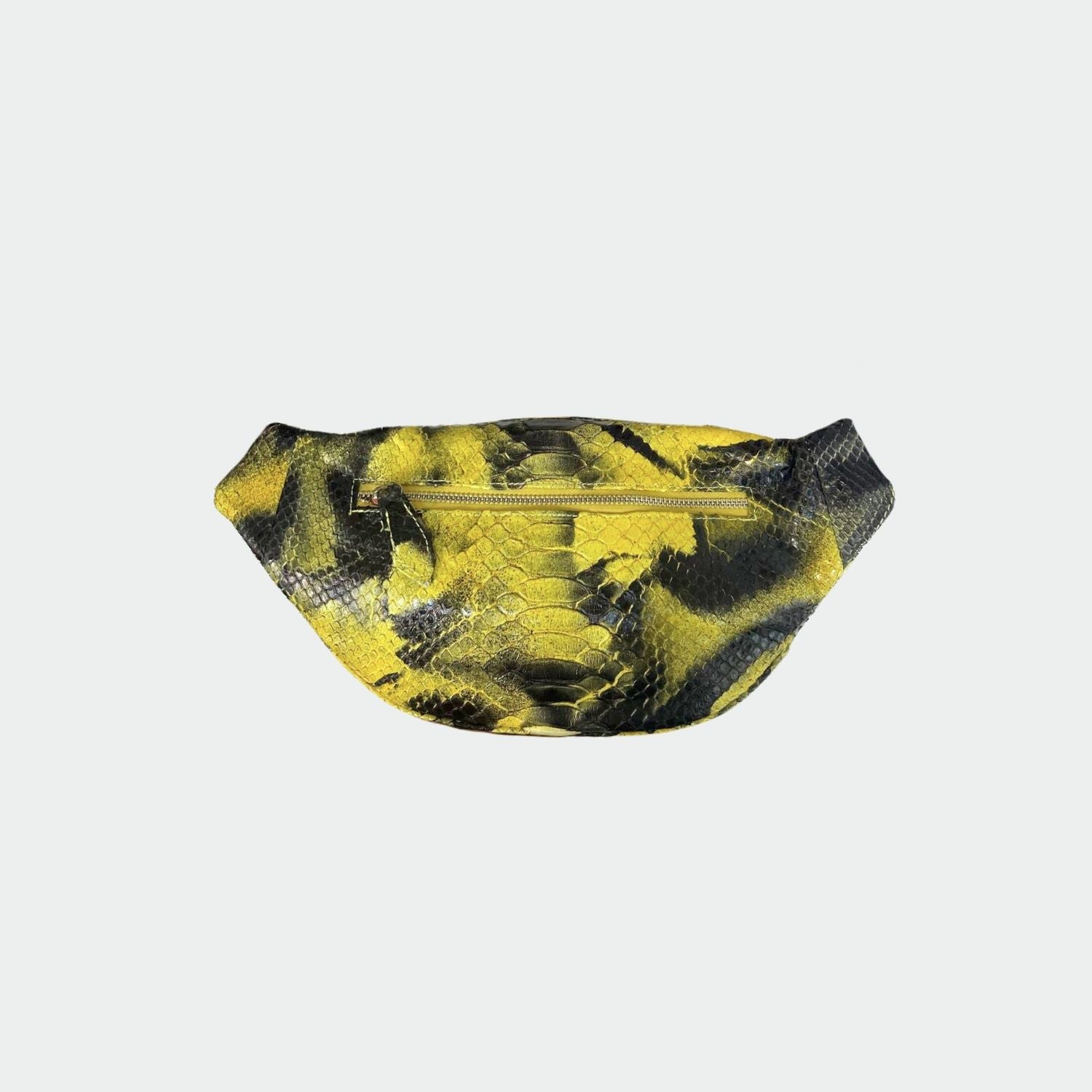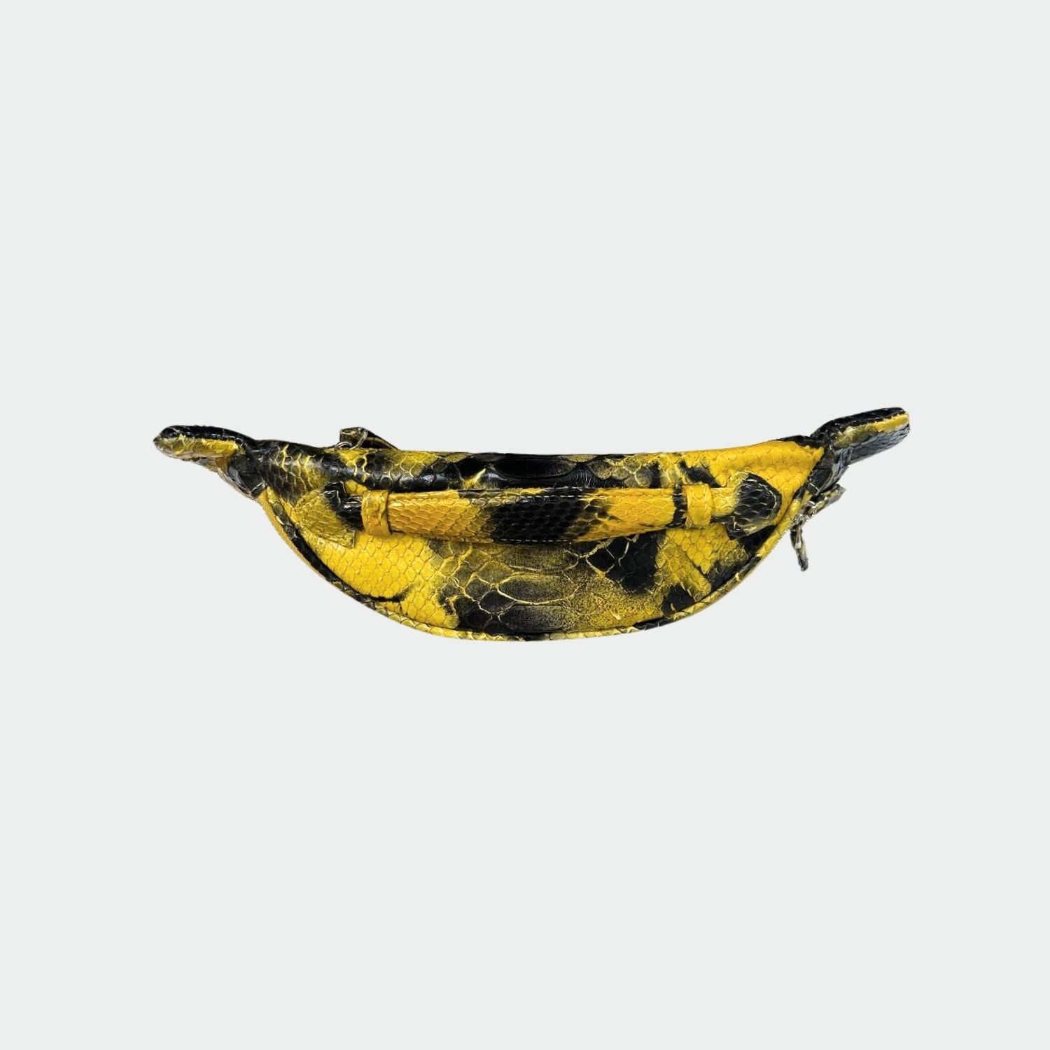 Banane en python avec doublure intérieure en coton. Compartiment unique avec fermeture en zip et poche arrière. Bandoulière en python.