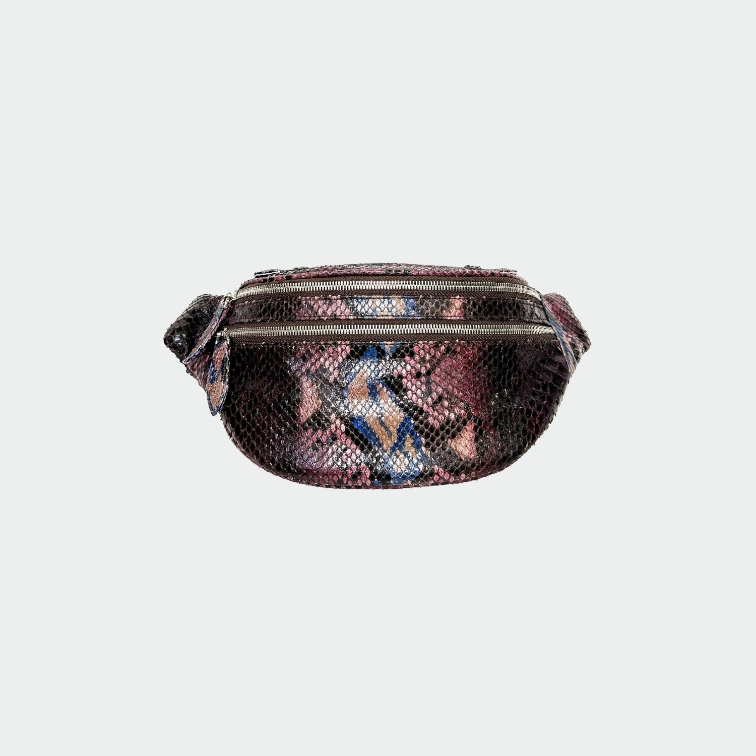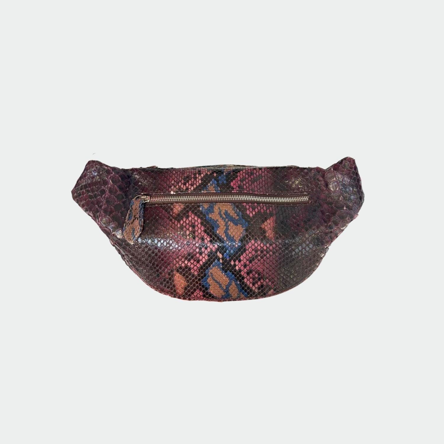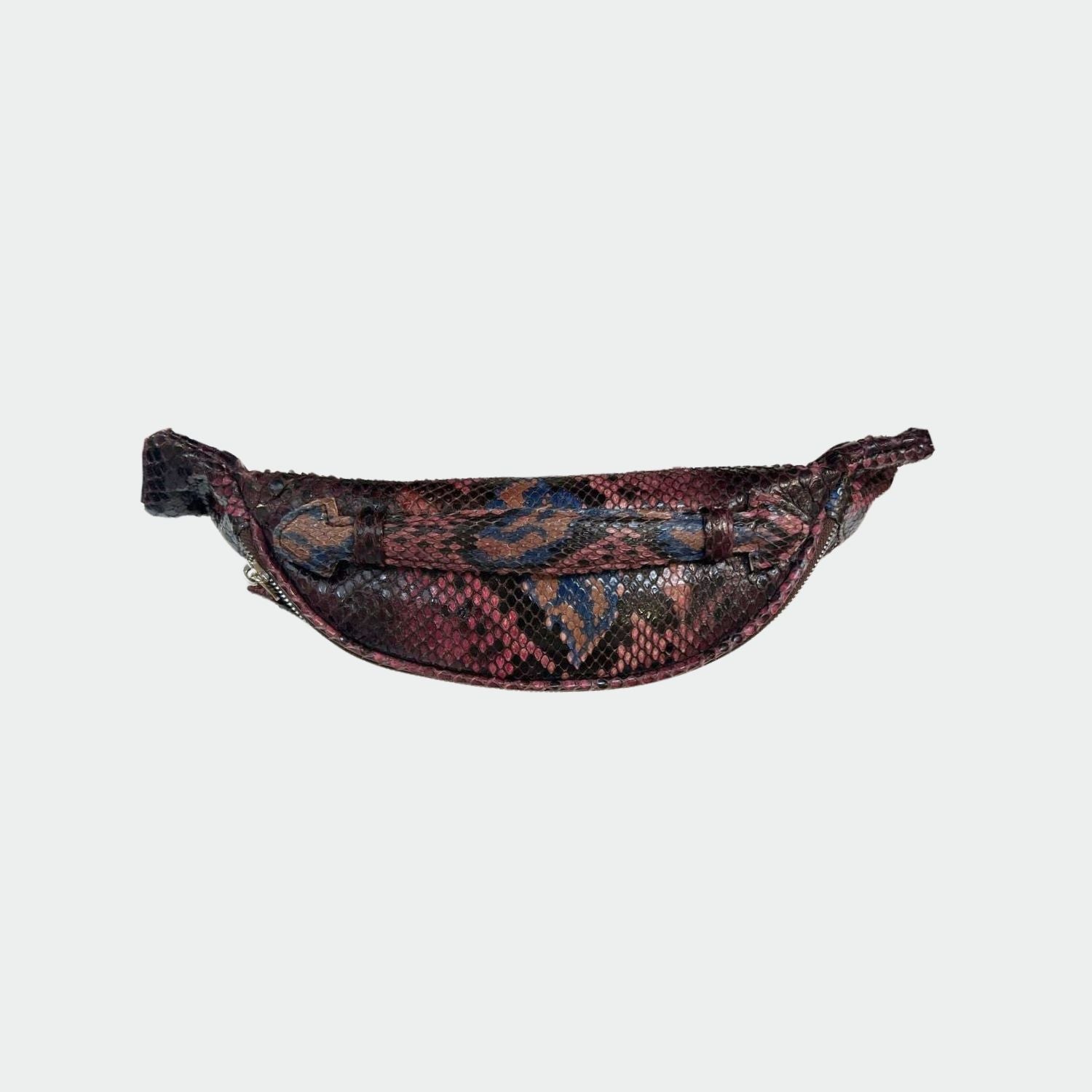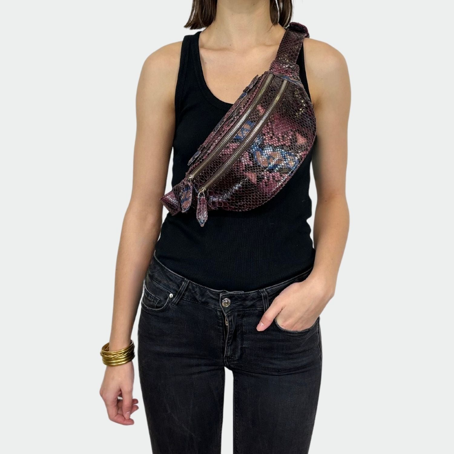 Banane en python avec doublure intérieure en coton. Compartiment unique avec fermeture en zip et poche arrière. Bandoulière en python.