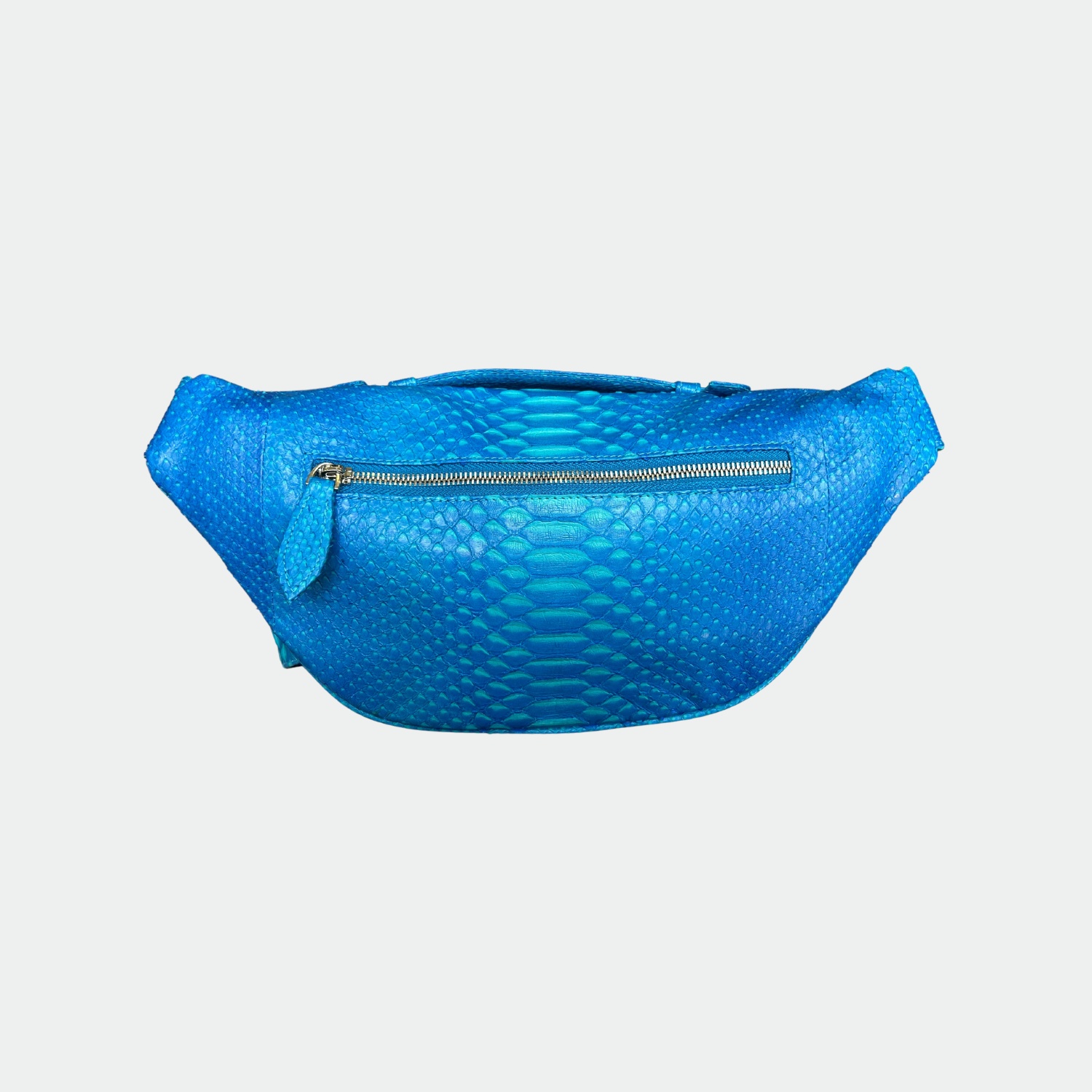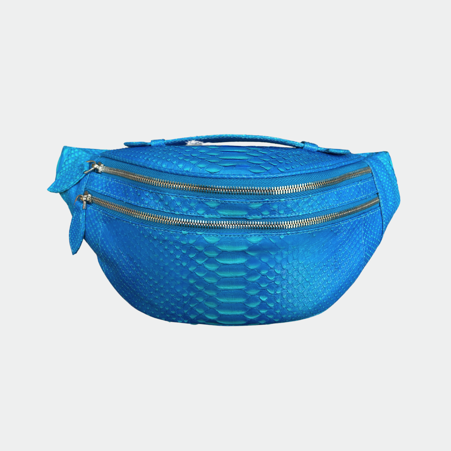 Banane en python avec doublure intérieure en coton. Compartiment unique avec fermeture en zip et poche arrière. Bandoulière en python.