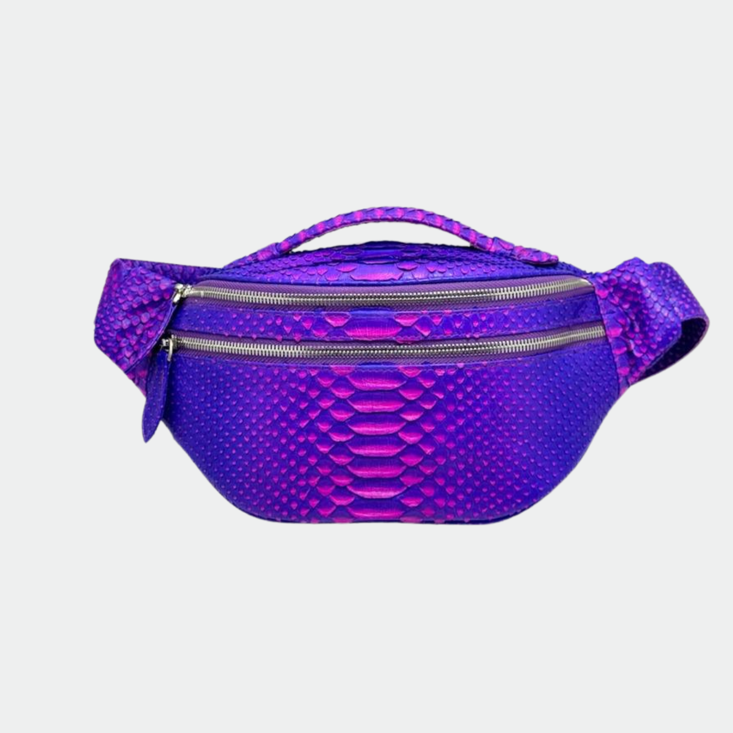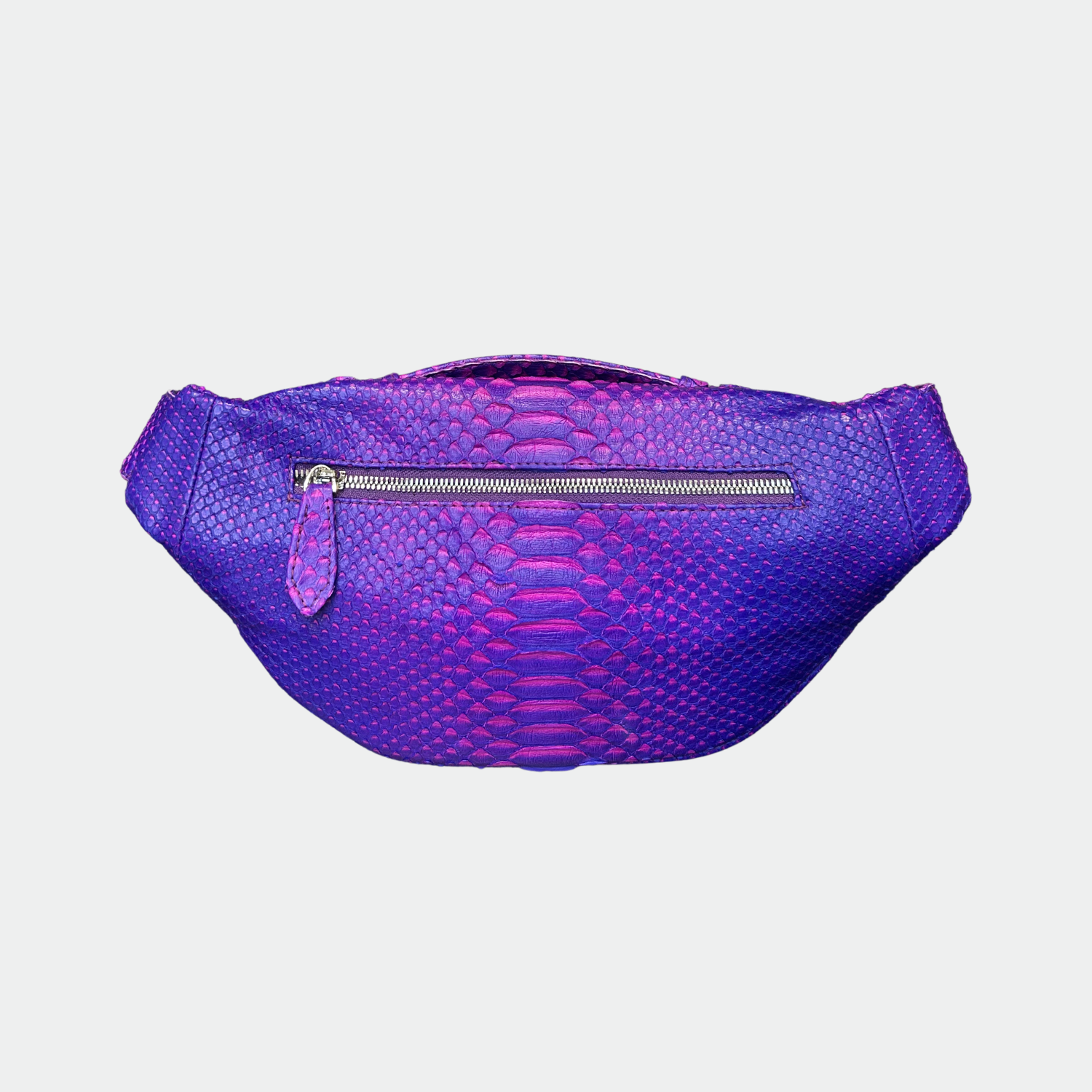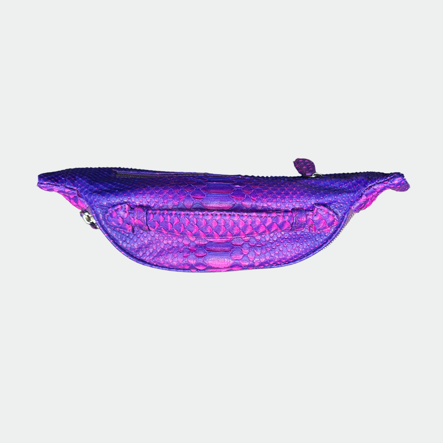 Banane en python avec doublure intérieure en coton. Compartiment unique avec fermeture en zip et poche arrière. Bandoulière en python.
