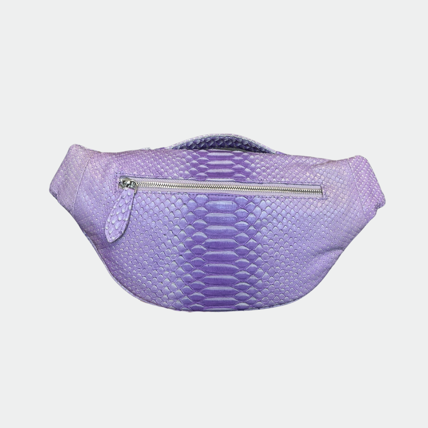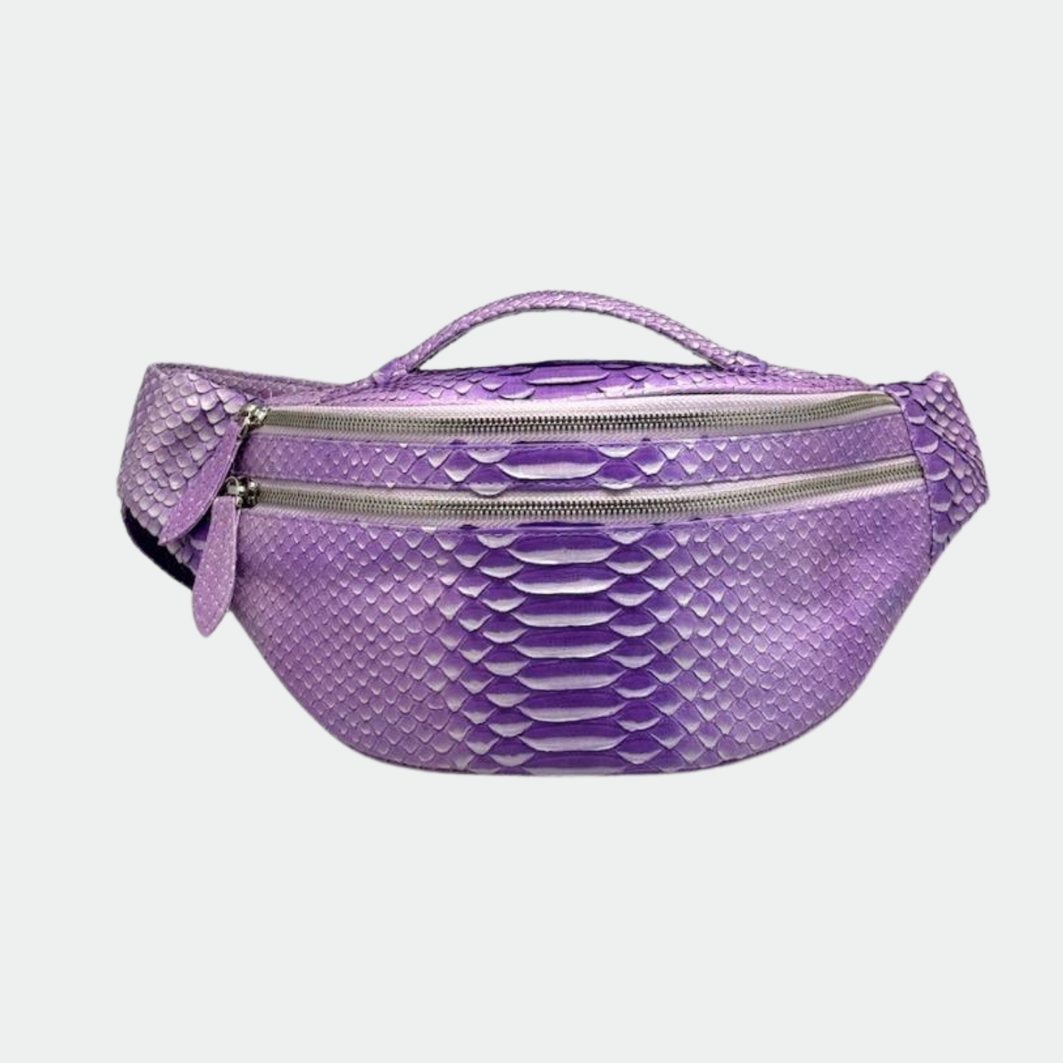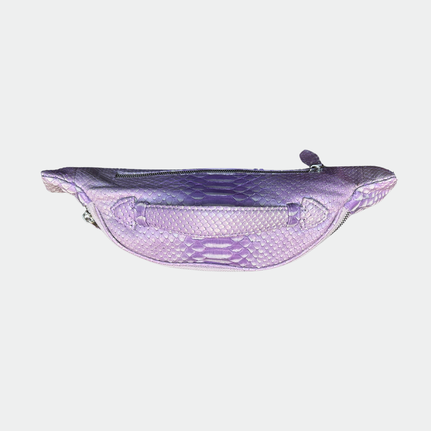 Banane en python avec doublure intérieure en coton. Compartiment unique avec fermeture en zip et poche arrière. Bandoulière en python.