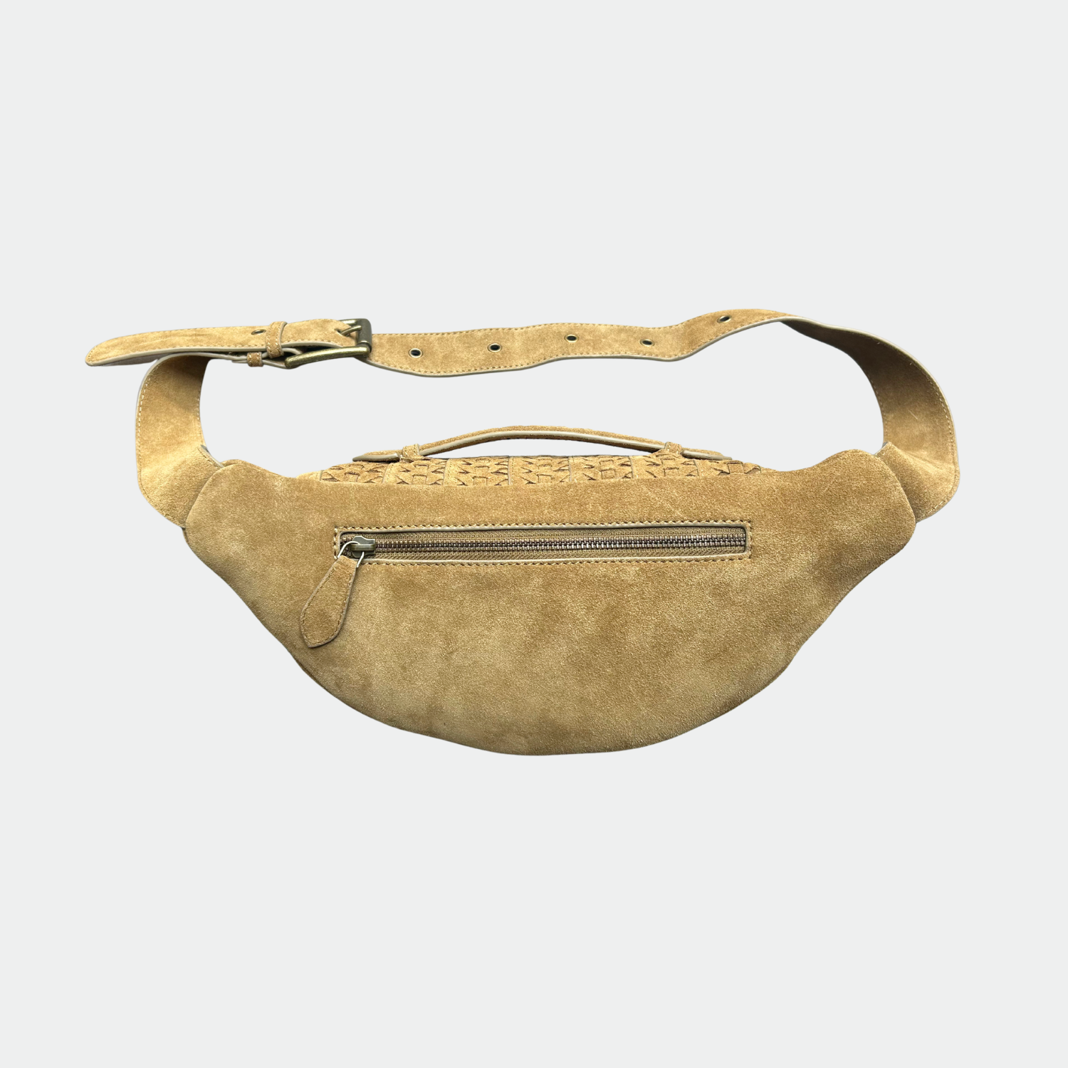Banane en nubuck avec doublure intérieure en coton. Compartiment unique avec fermeture en zip et poche arrière. Bandoulière en nubuck. Métallerie old gold.