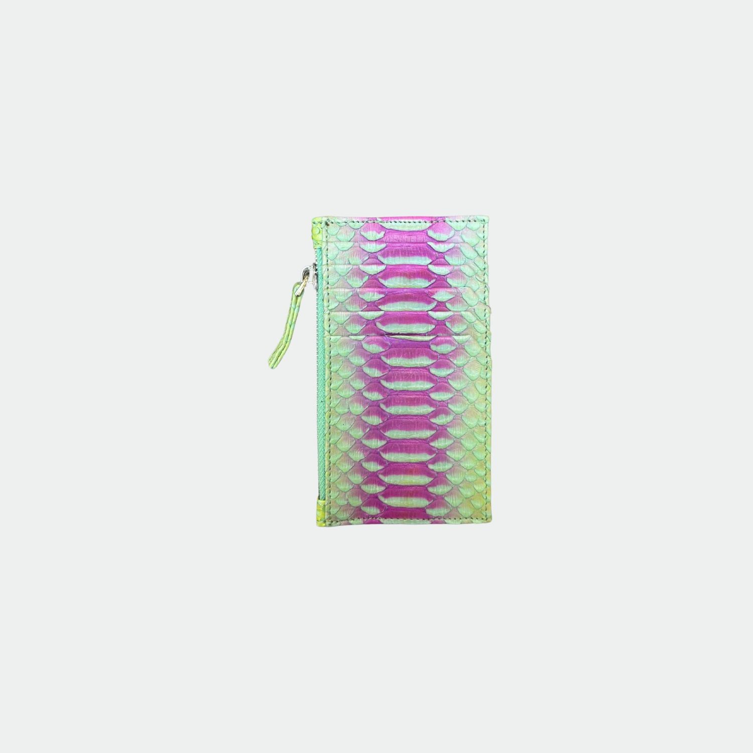Porte carte en python. Cinq compartiments pour carte avec pochette zippée. Zip de fermeture en