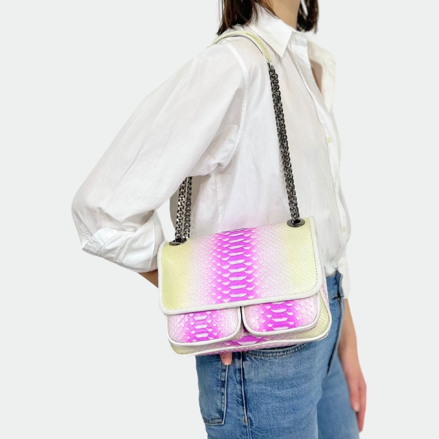 Sac en python, avec doublure intérieure en coton et anses en python et cuir. Un compartiment principal avec une petite poche et deux autres compartiments. Bandoulière métallique.