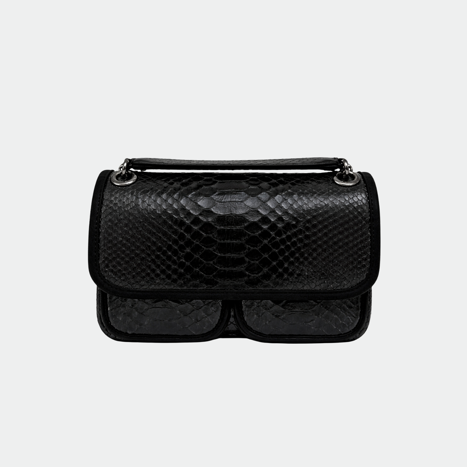 Sac en python, avec doublure intérieure en coton et anses en python et cuir. Un compartiment principal avec une petite poche et deux autres compartiments. Bandoulière métallique.