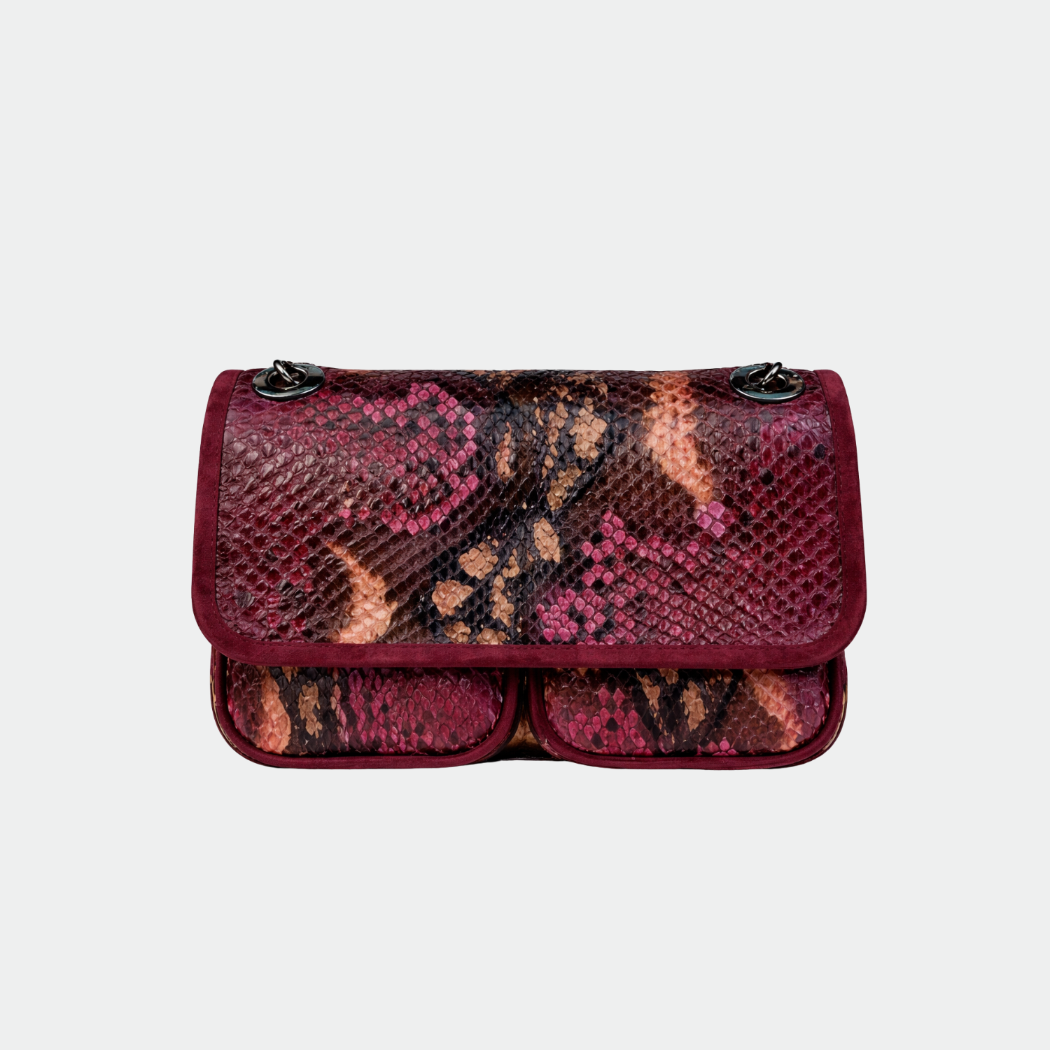 Sac en python, avec doublure intérieure en coton et anses en python et cuir. Un compartiment principal avec une petite poche et deux autres compartiments. Bandoulière métallique.