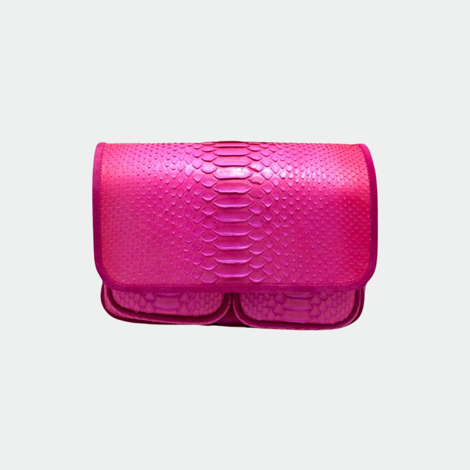 Sac en python, avec doublure intérieure en coton et anses en python et cuir. Un compartiment principal avec une petite poche et deux autres compartiments. Bandoulière métallique.