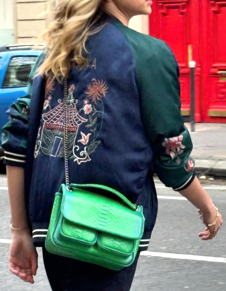 Sac en python, avec doublure intérieure en coton et anses en python et cuir. Un compartiment principal avec une petite poche et deux autres compartiments. Bandoulière métallique.