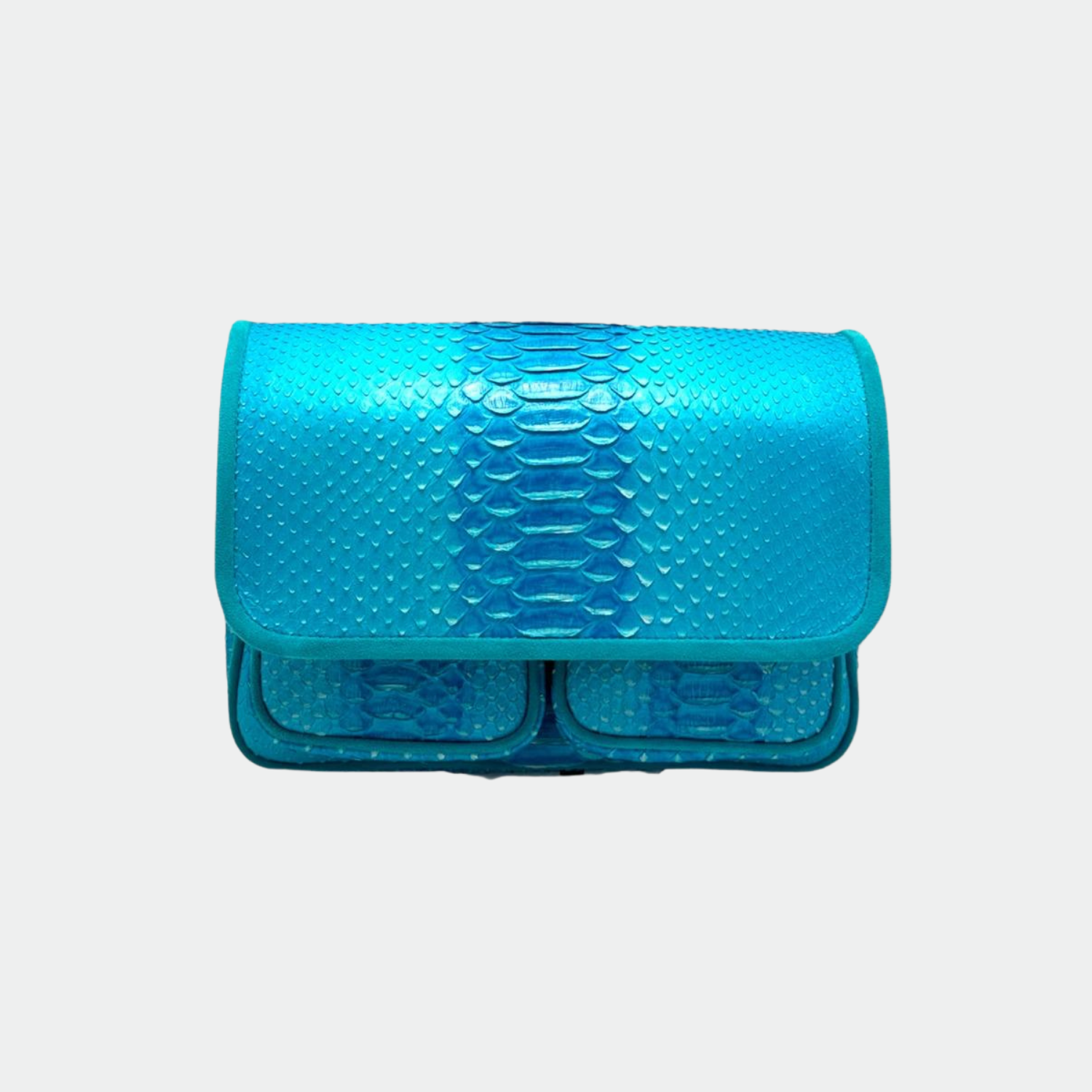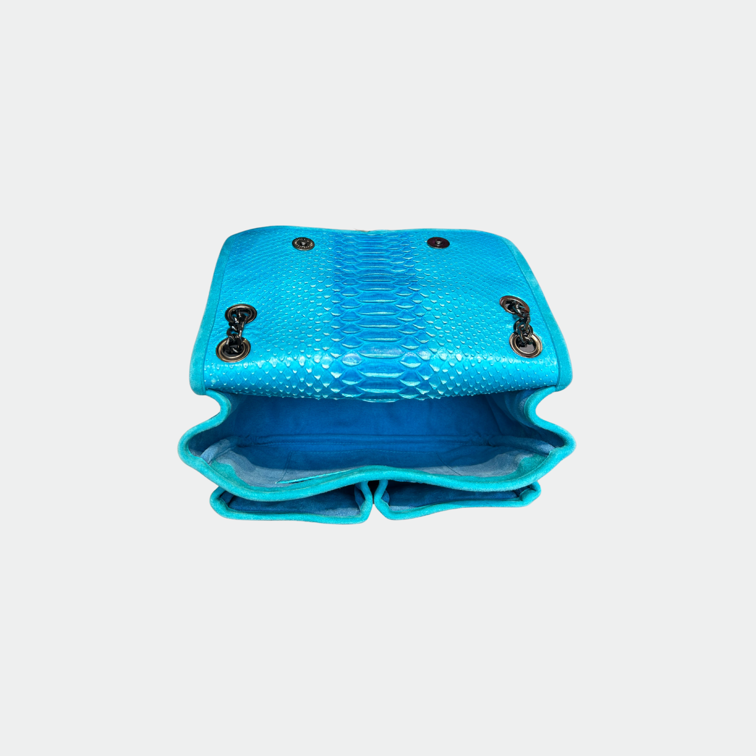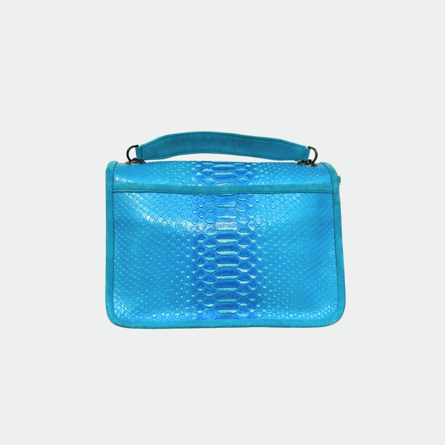 Sac en python, avec doublure intérieure en coton et anses en python et cuir. Un compartiment principal avec une petite poche et deux autres compartiments. Bandoulière métallique.