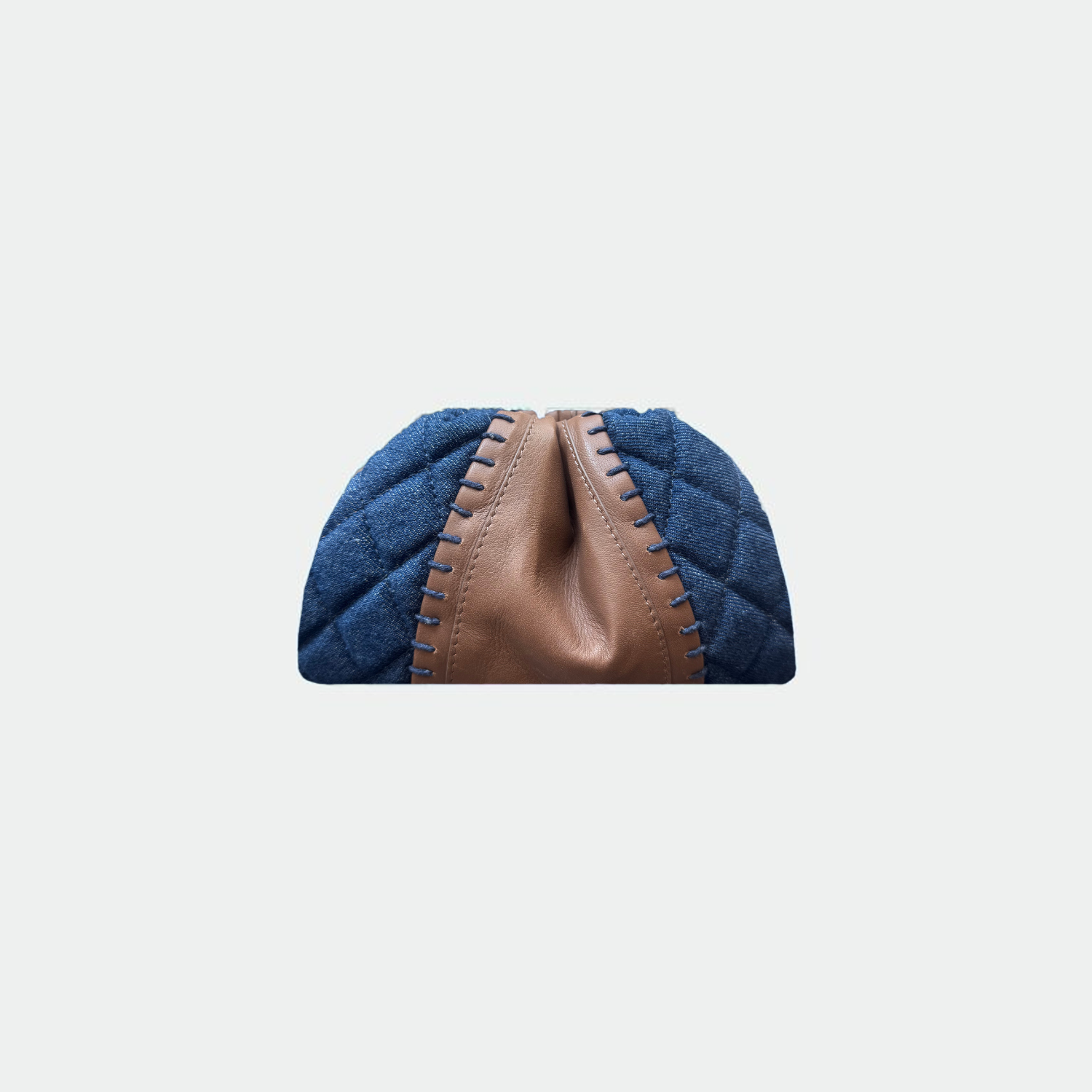 Pochette souple en denim et cuir de veau, avec doublure intérieure en coton et fermeture magnétique. Compartiment unique avec petite poche. Bandoulière en cuir de veau.
