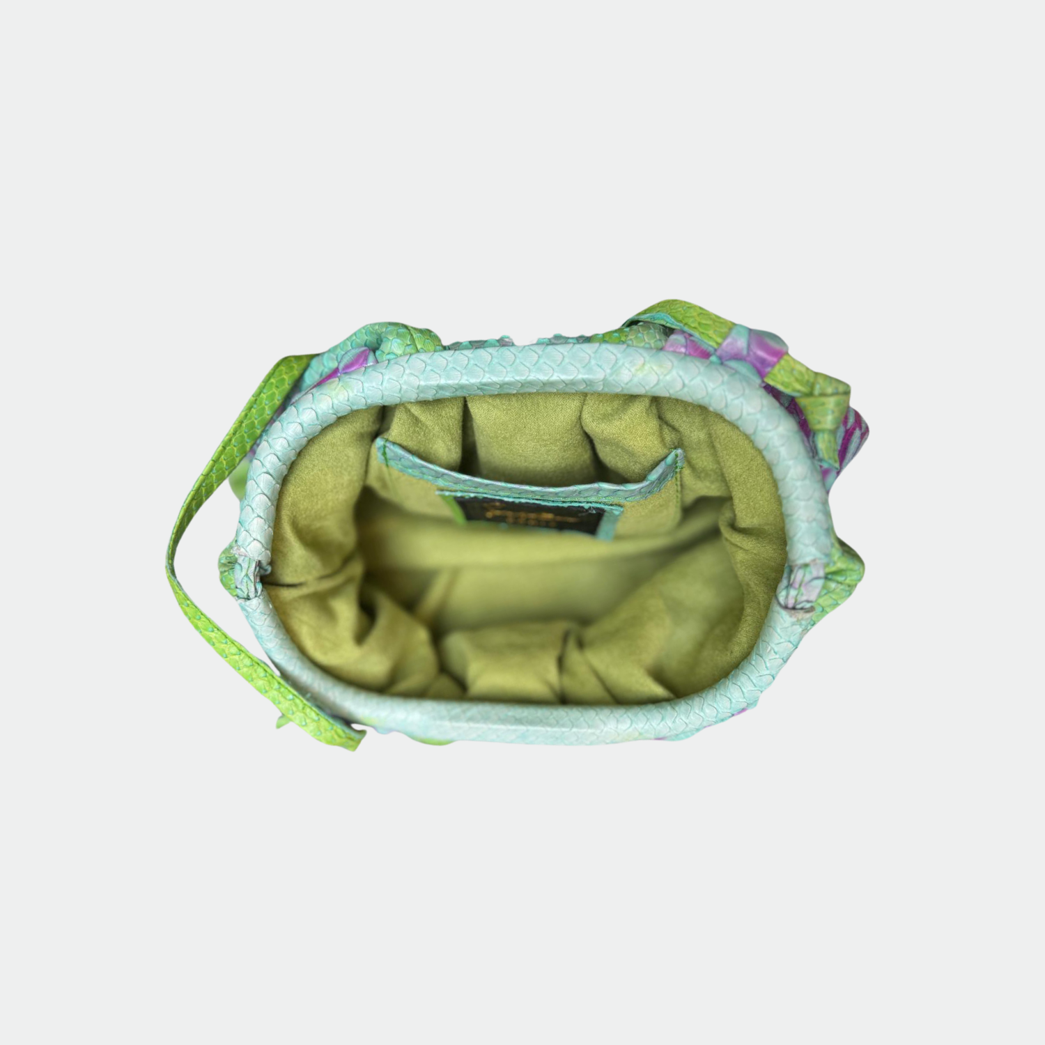 Pochette souple en python, avec doublure intérieure en coton et fermeture magnétique.