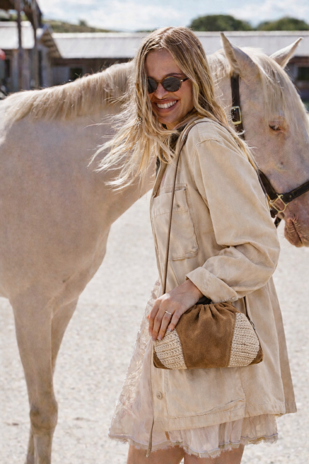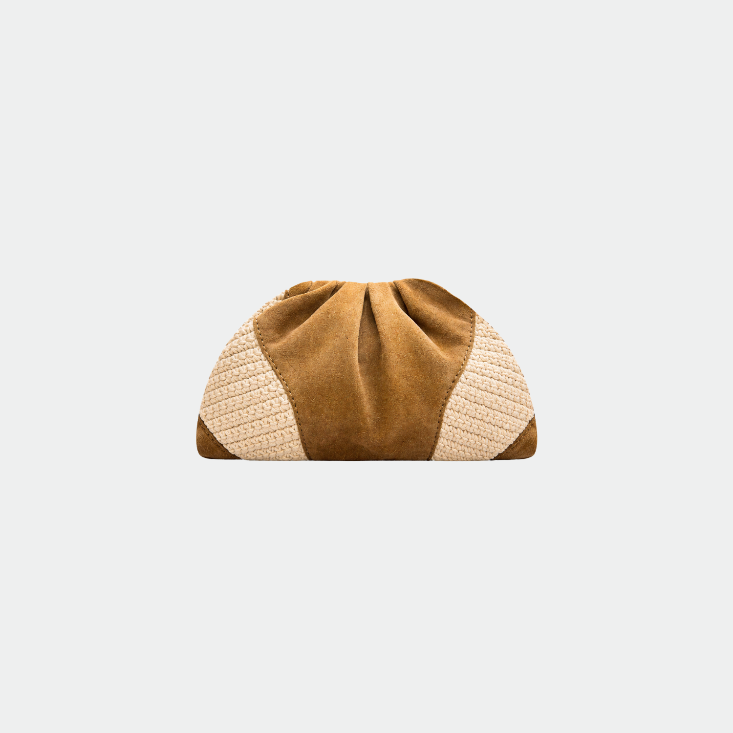 Pochette souple en nubuck et empiècements en crochet coton, avec doublure intérieure en coton et fermeture magnétique.