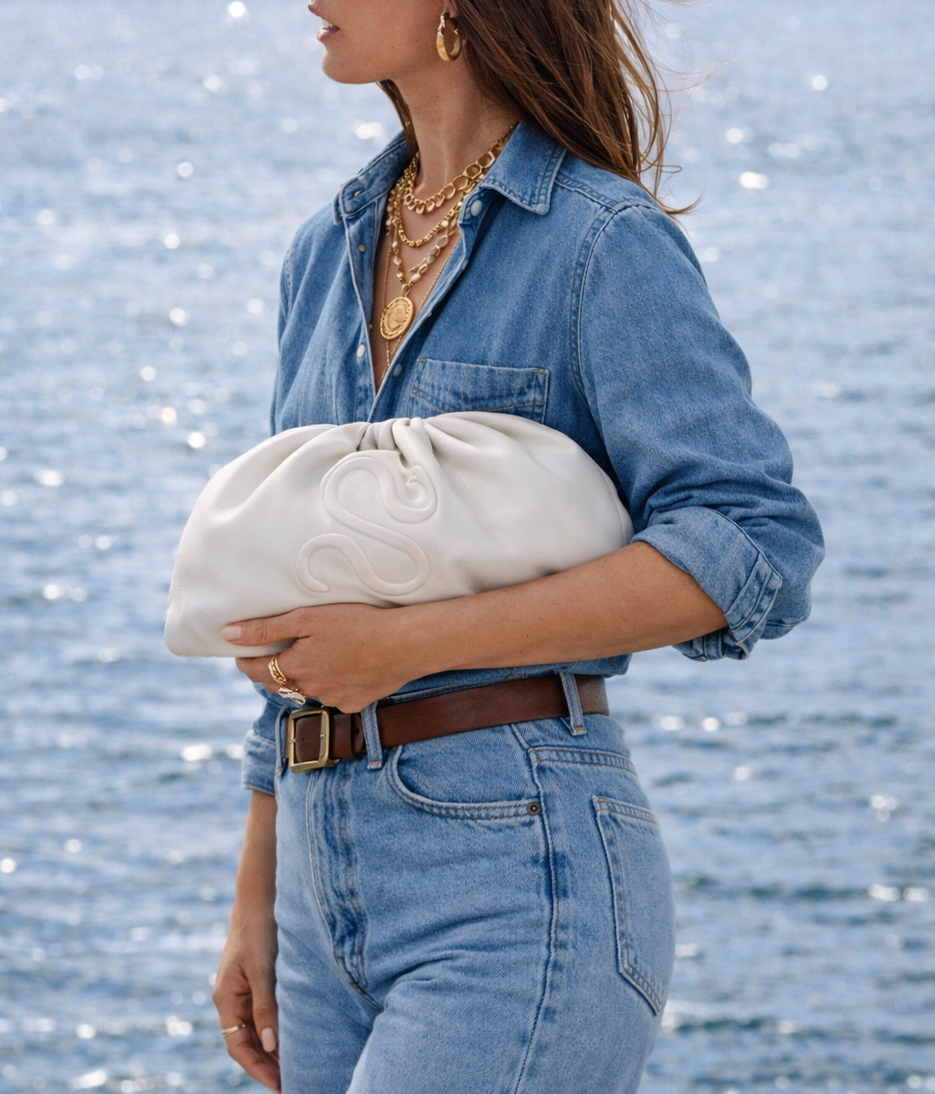unique avec petite poche. Finitions métalliques couleur old gold. Bandoulière amovible en cuir.