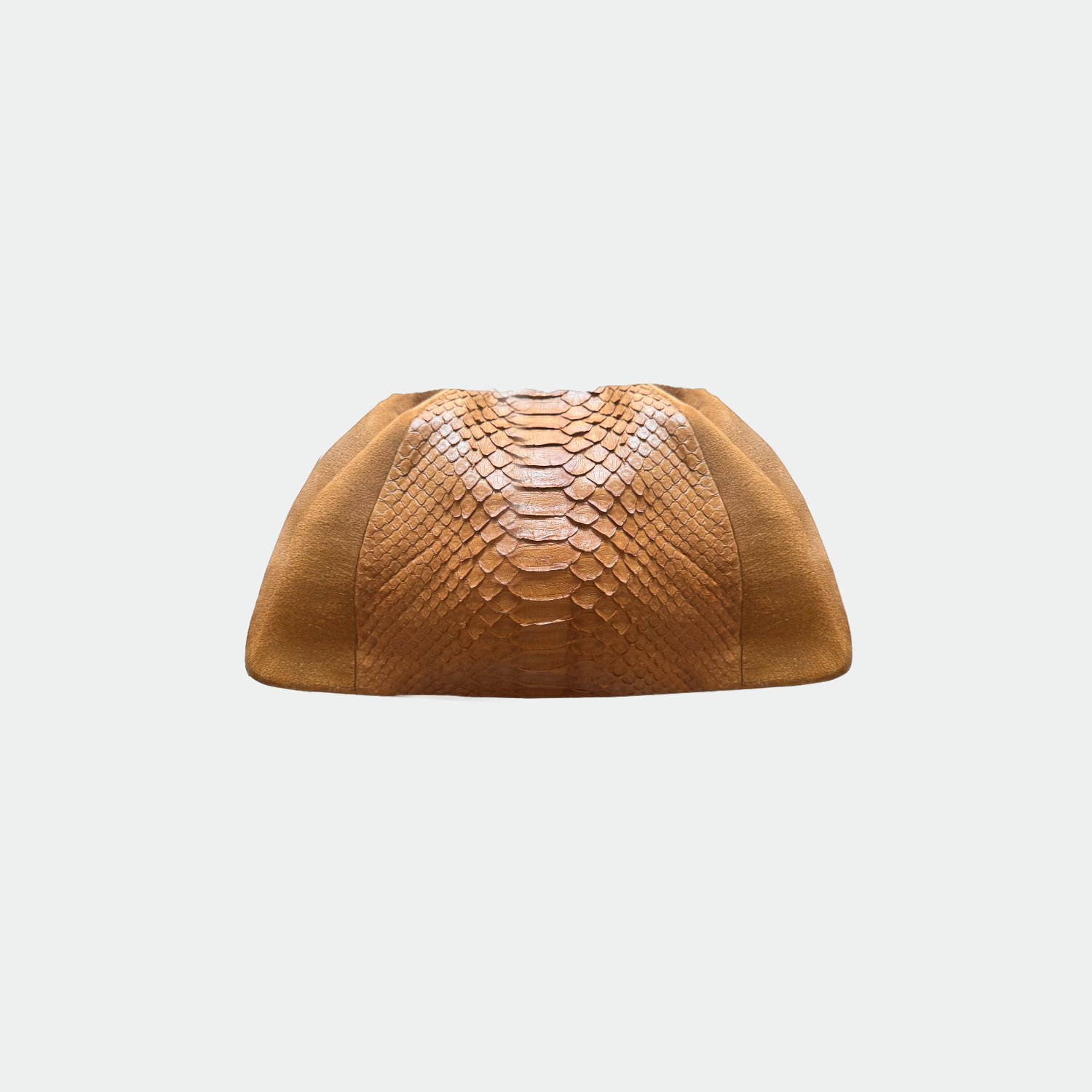 Pochette souple en cuir de veau façon velours sur les côtés et en cuir de python au milieu, avec doublure intérieure en coton et fermeture magnétique. Compartiment unique avec petite poche. Finitions métalliques dorées. Bandoulière amovible en cuir de veau.