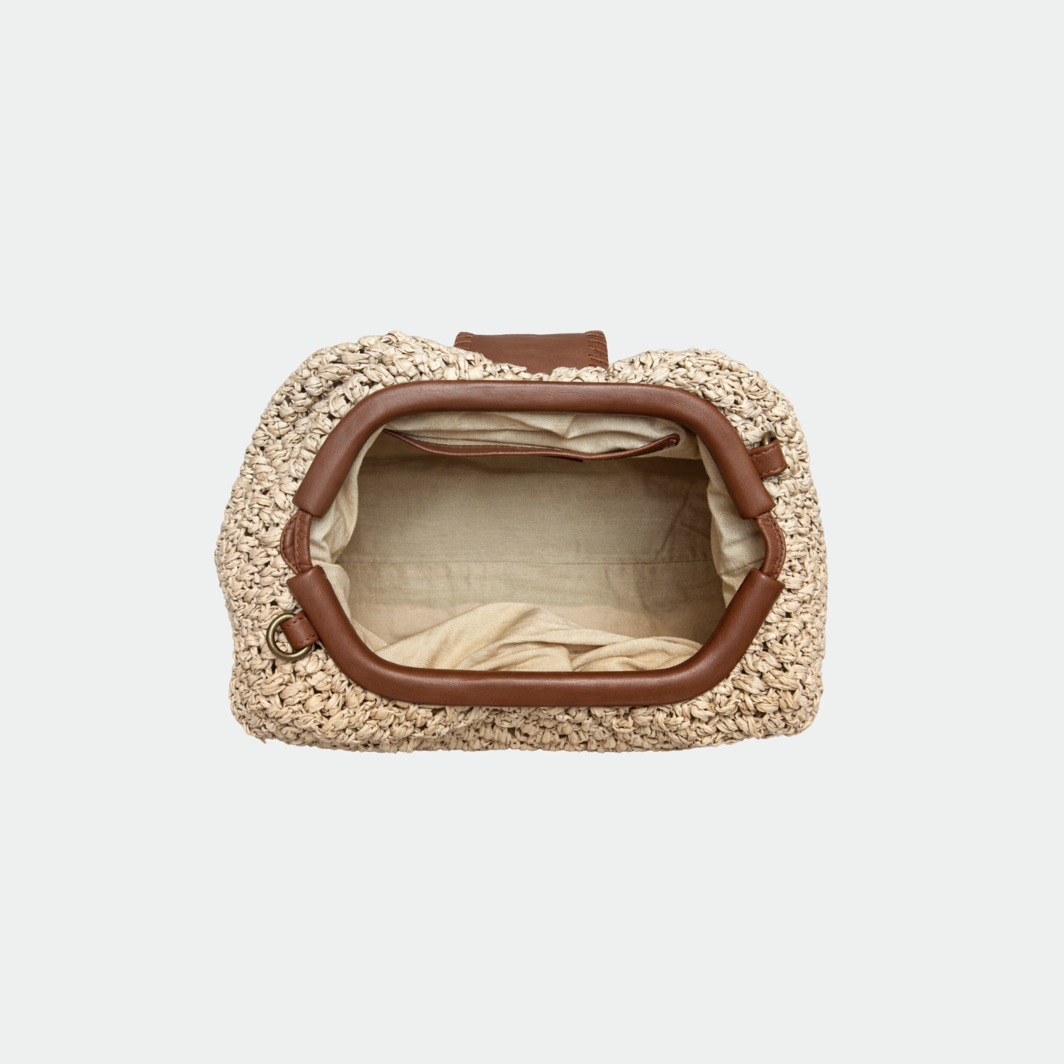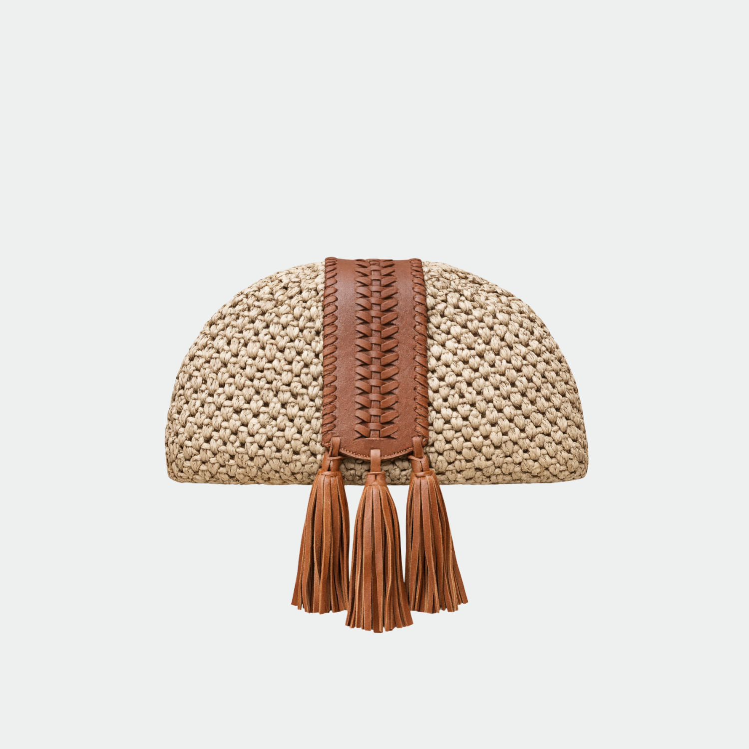 Pochette souple en raphia et rabat tressé et frangé en cuir, avec doublure intérieure en coton et fermeture magnétique. Compartiment
