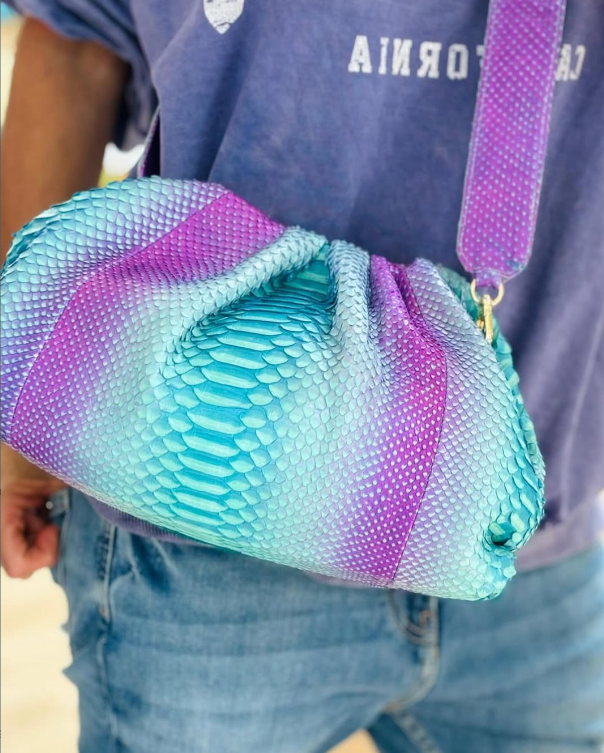 Pochette souple en python, avec doublure intérieure en coton et fermeture magnétique.