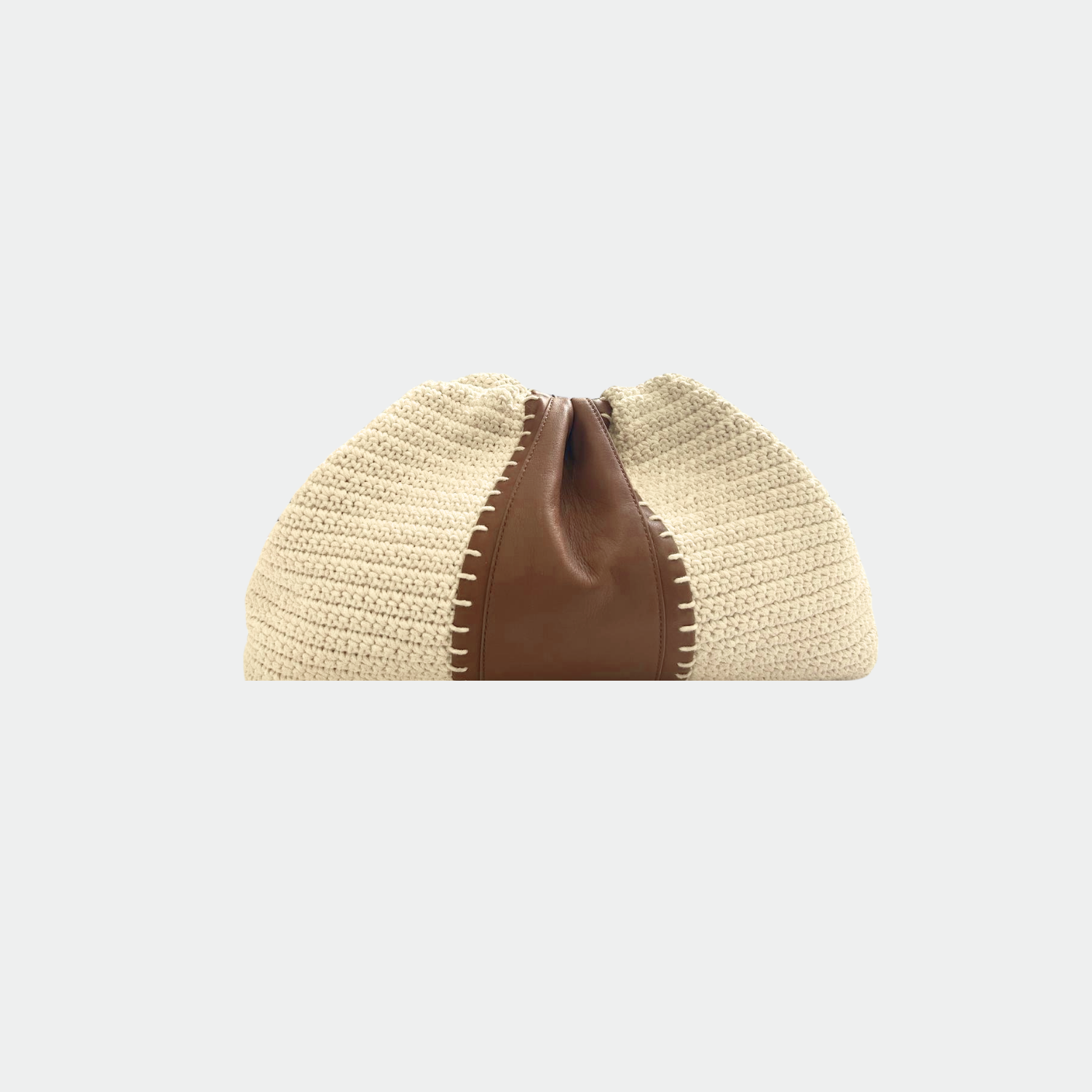 Pochette souple en crochet et empiècement cuir, avec doublure intérieure en coton et fermeture magnétique. Compartiment