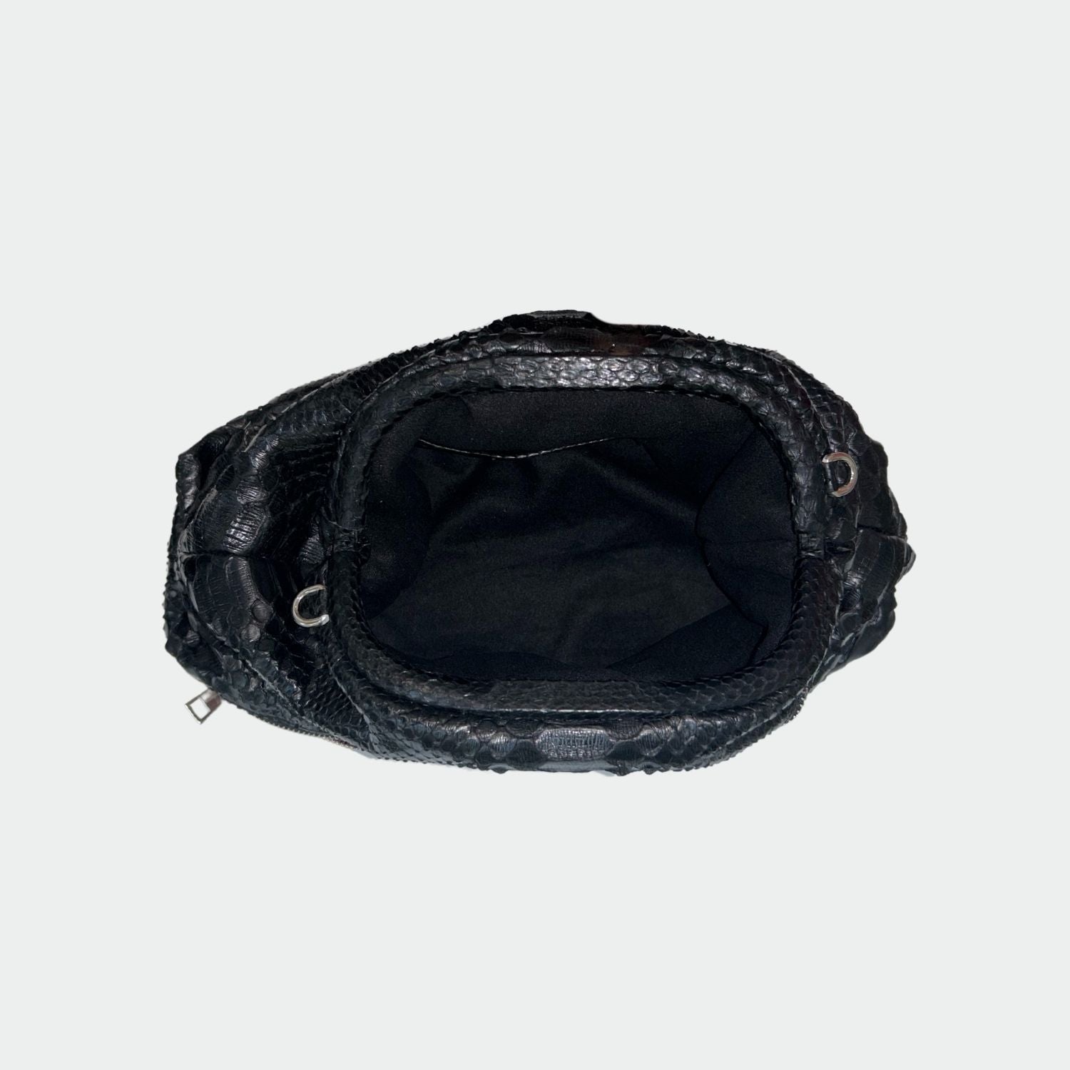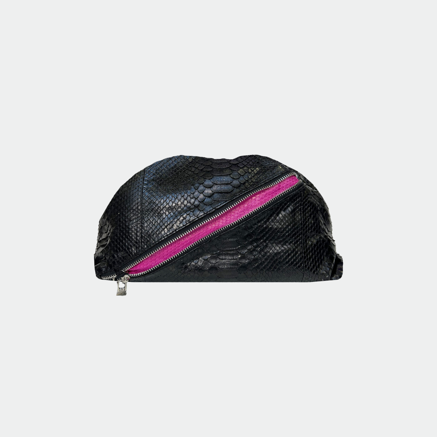 Pochette souple en python, avec doublure intérieure en coton et fermeture magnétique.