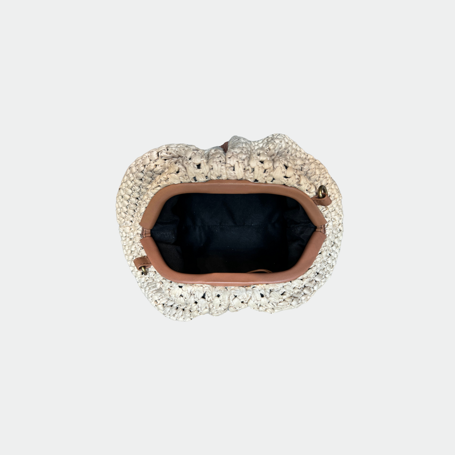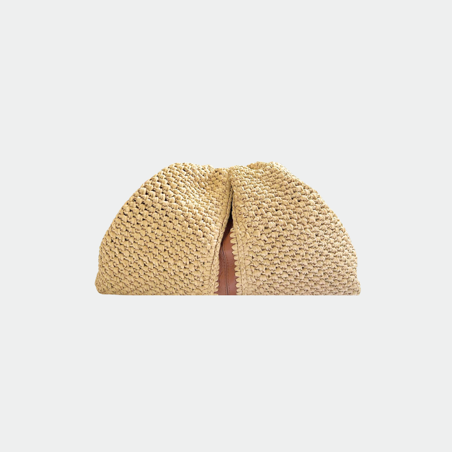 Pochette souple en raphia et empiècement cuir, avec doublure intérieure en coton et fermeture magnétique. Compartiment